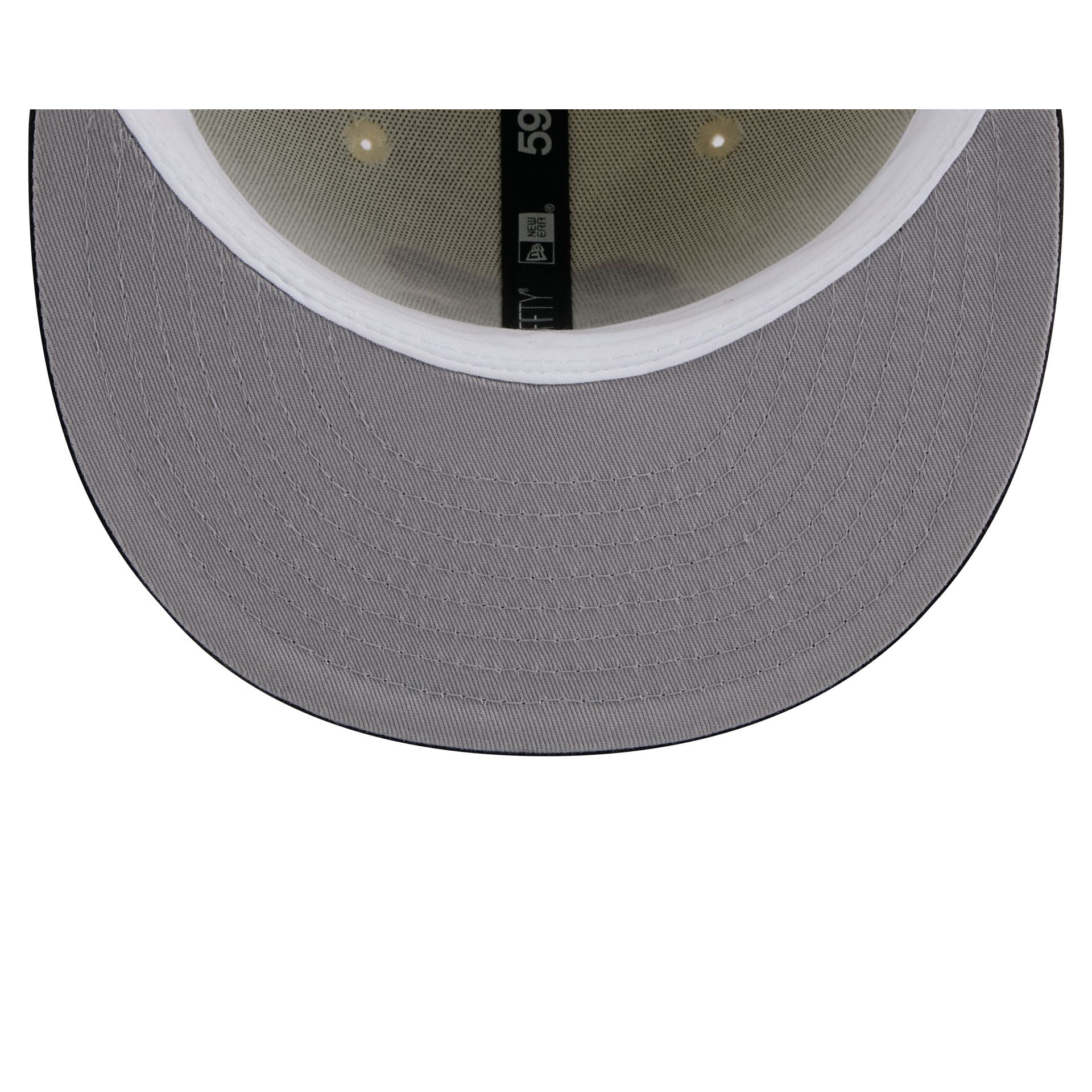 The Baltimore Orioles Chrome 59FIFTY Fitted Cap features an embroidered Orioles logo at the front panels with a matching MLB Batterman logo at the rear. a black visor. and a gray undervisor.