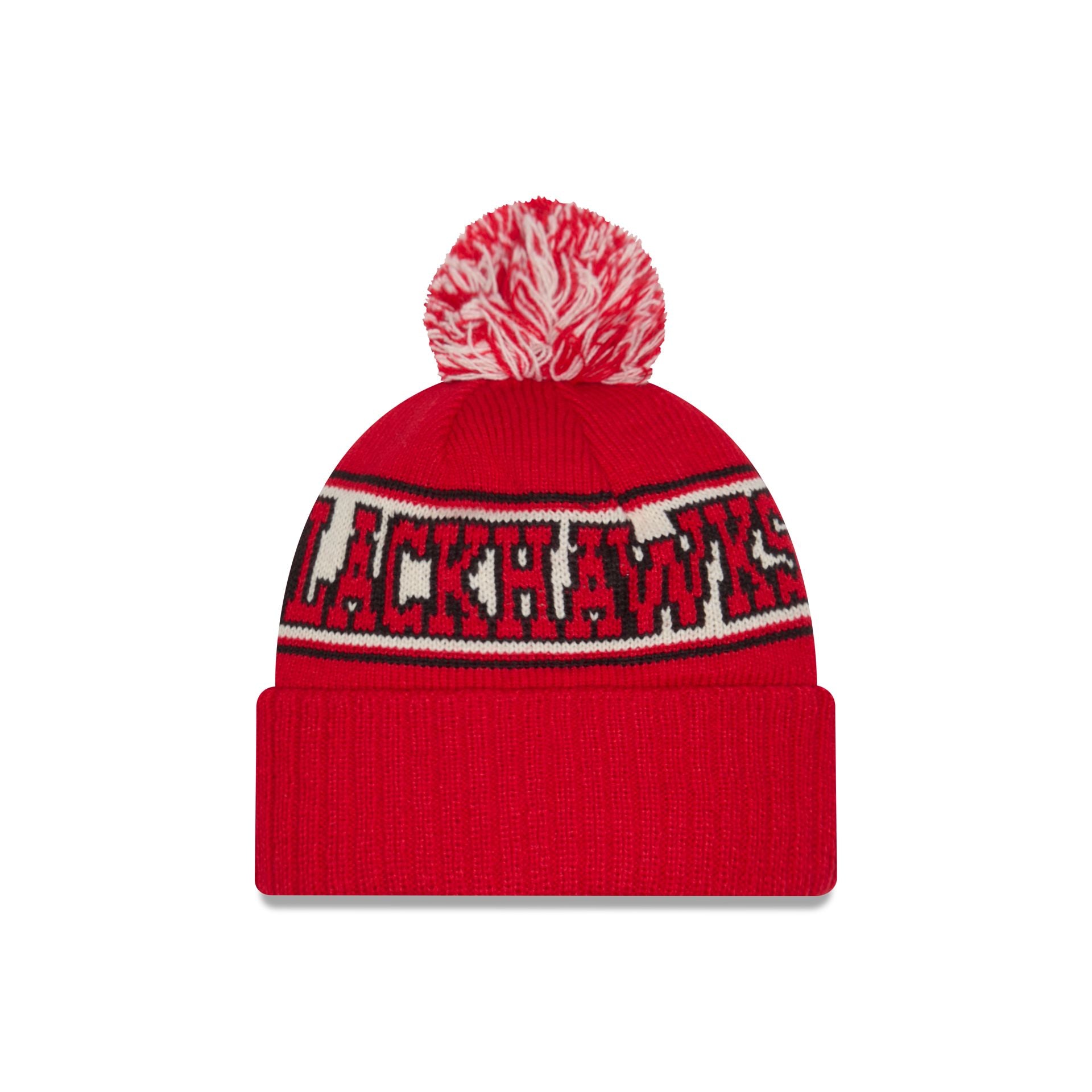 The Chicago Blackhawks Pom Knit Hat features an embroidered Blackhawks logo at the front cuff with a wordmark at the crown and a one-time removeable pom.