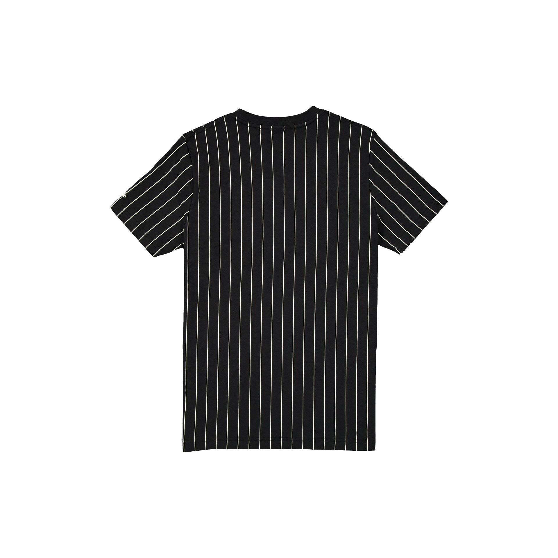 The Chicago Bulls Throwback Pinstripe Wordmark T-Shirt features a twill applique Bulls wordmark and logo at the front with a New Era jock tag at the left hip.