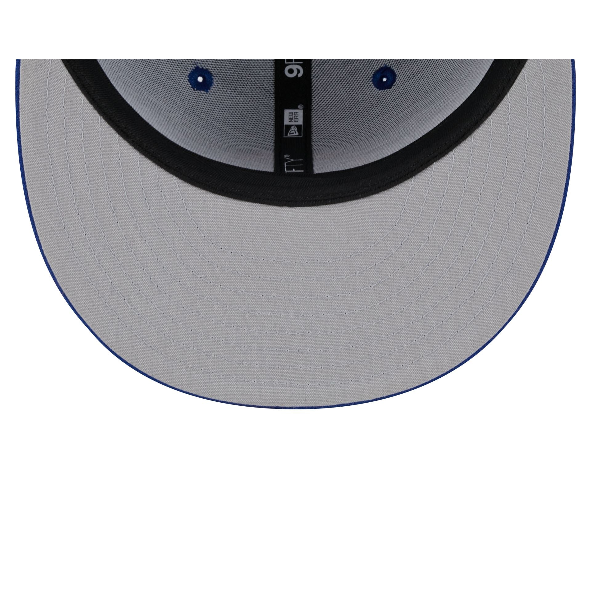 The Chicago Cubs 2025 Batting Practice 9FIFTY Snapback features an embroidered Cubs logo at the front panels with a matching snapback closure at the rear. Additional details include a pivot knit fabrication. a blue visor. and a gray undervisor.