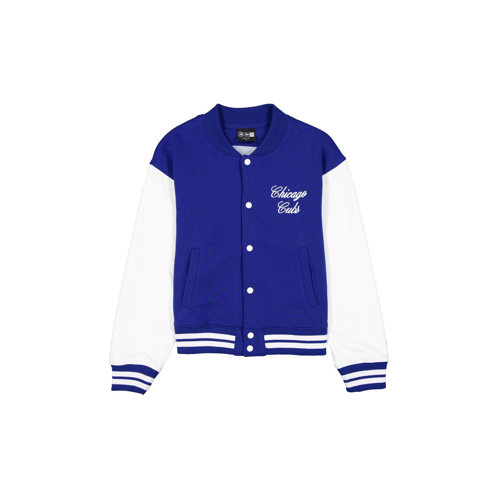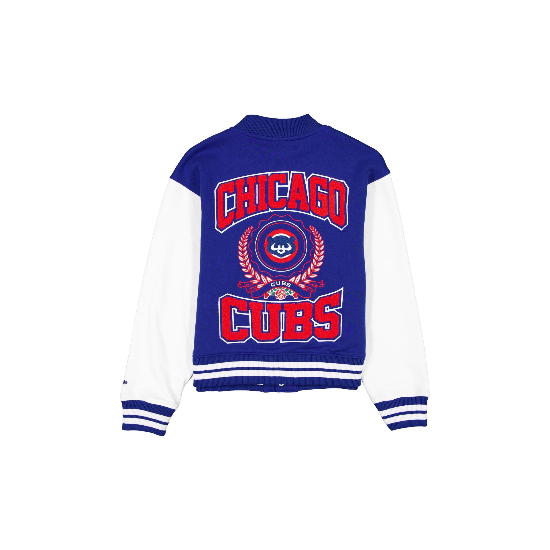 The Chicago Cubs Throwback Prep Women’s Jacket features a chain-stitched Cubs script at the left chest with a snap front closure and a chenille applique wordmark with team emblem at the rear.