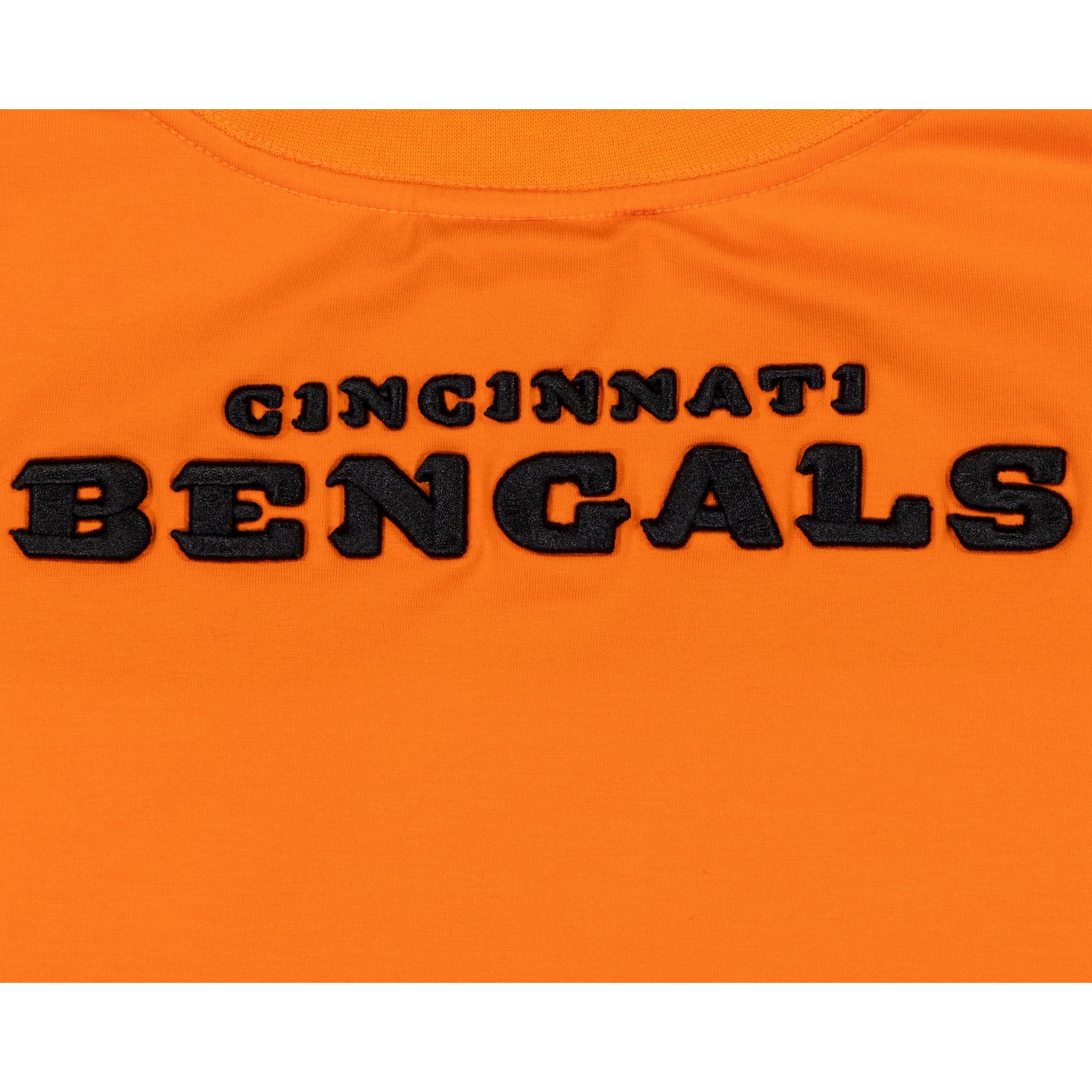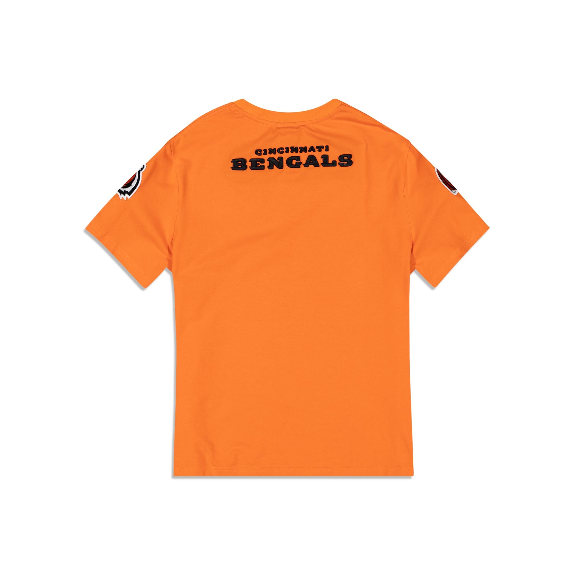 The Cincinnati Bengals Logo Select T-Shirt features a chenille applique Bengals logo at the left chest with team patches at each sleeve and an embroidered team wordmark at the rear.