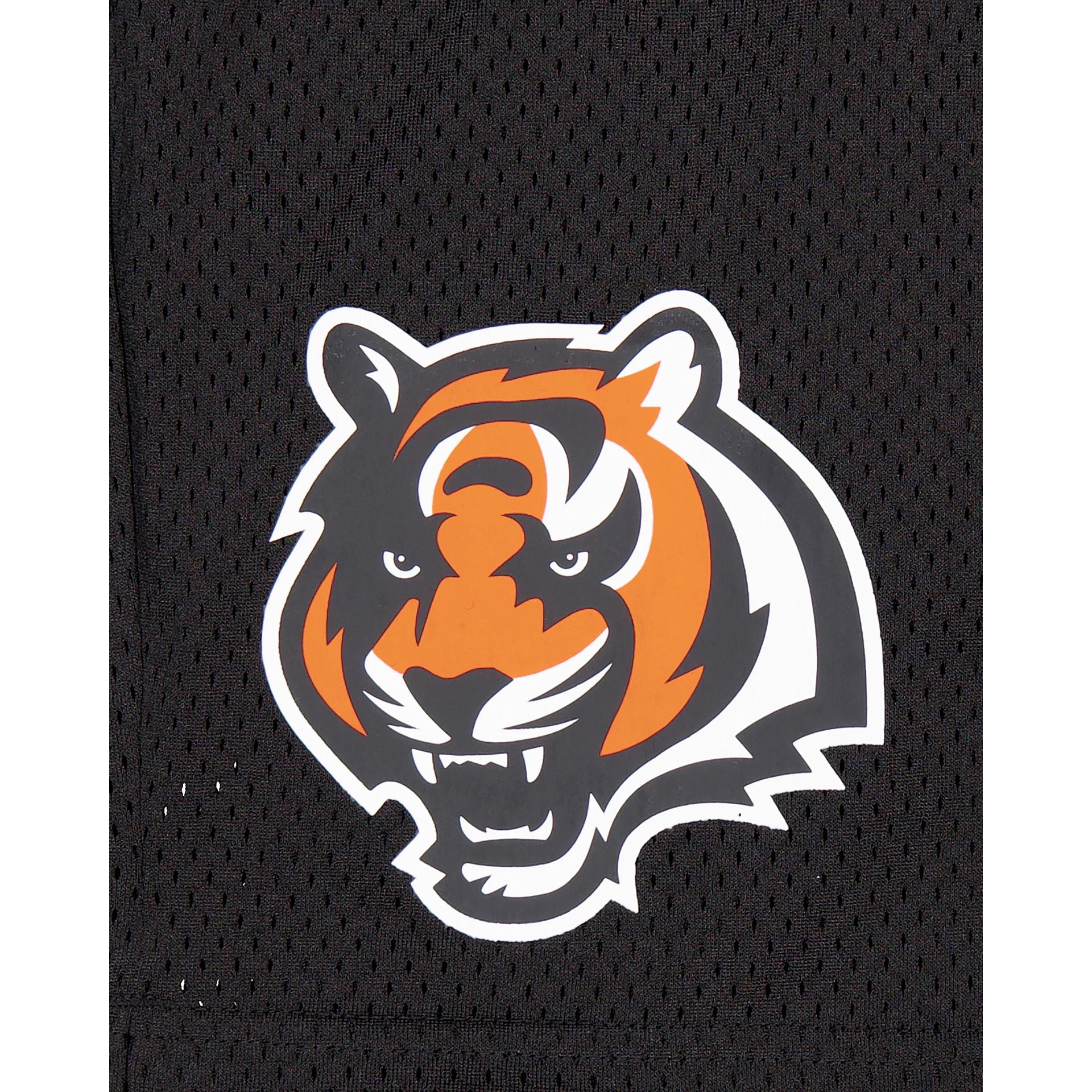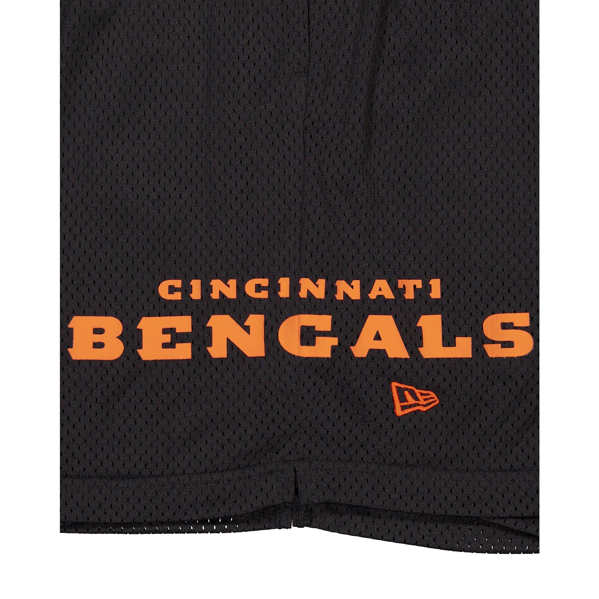 The Cincinnati Bengals Mesh Shorts features a screen-printed Bengals logo at the left leg with a team wordmark at the right leg.