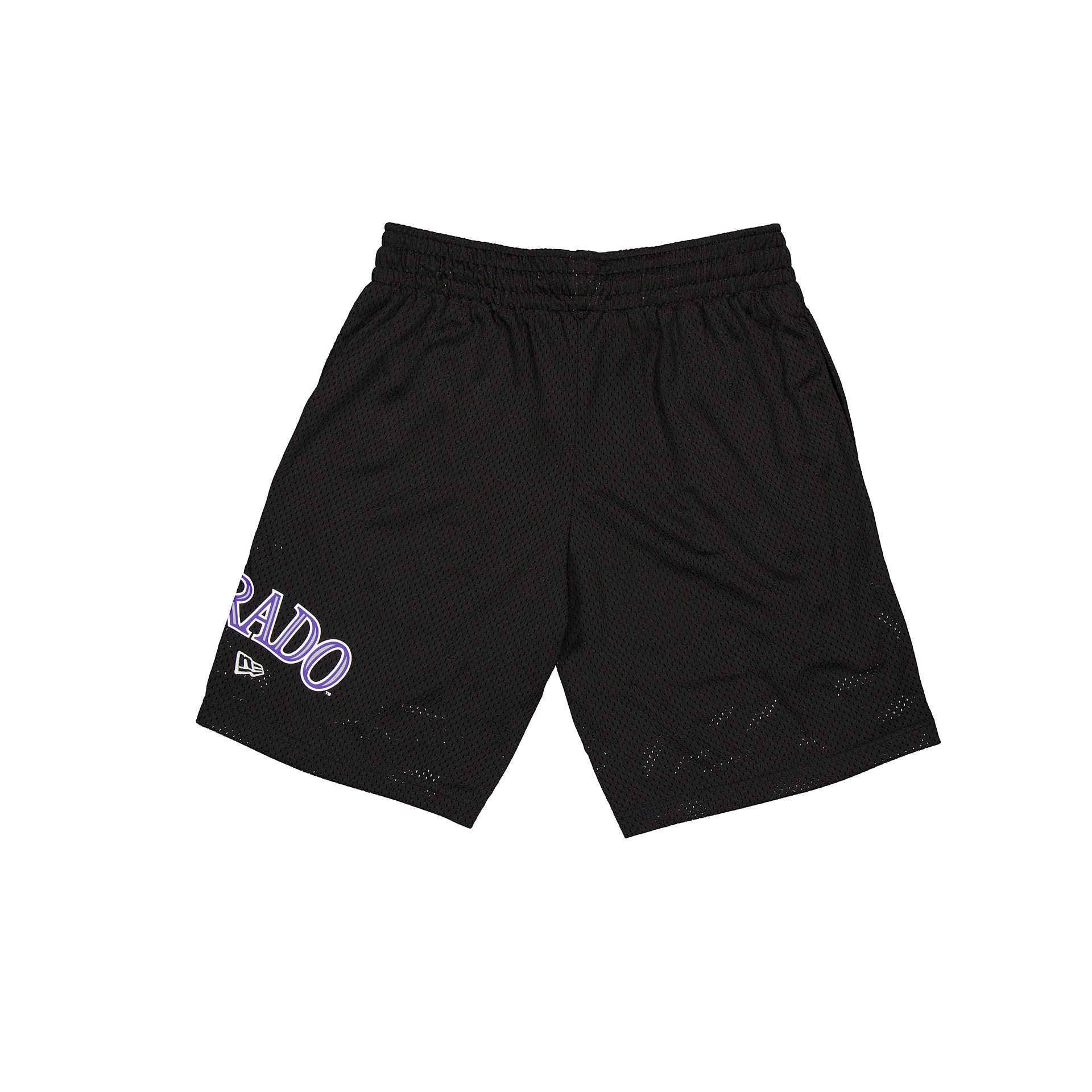 The Colorado Rockies Mesh Shorts features a screen-printed Rockies logo at the left leg with a team wordmark at the right leg.