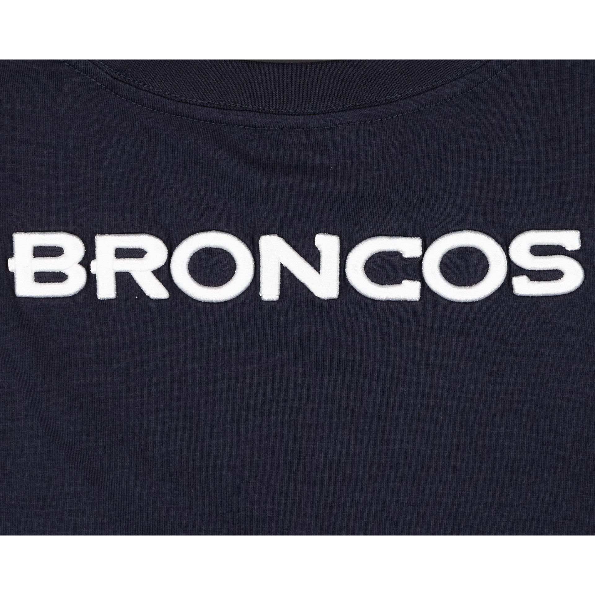 The Denver Broncos Logo Select T-Shirt features a chenille applique Broncos logo at the left chest with team patches at each sleeve and an embroidered team wordmark at the rear.