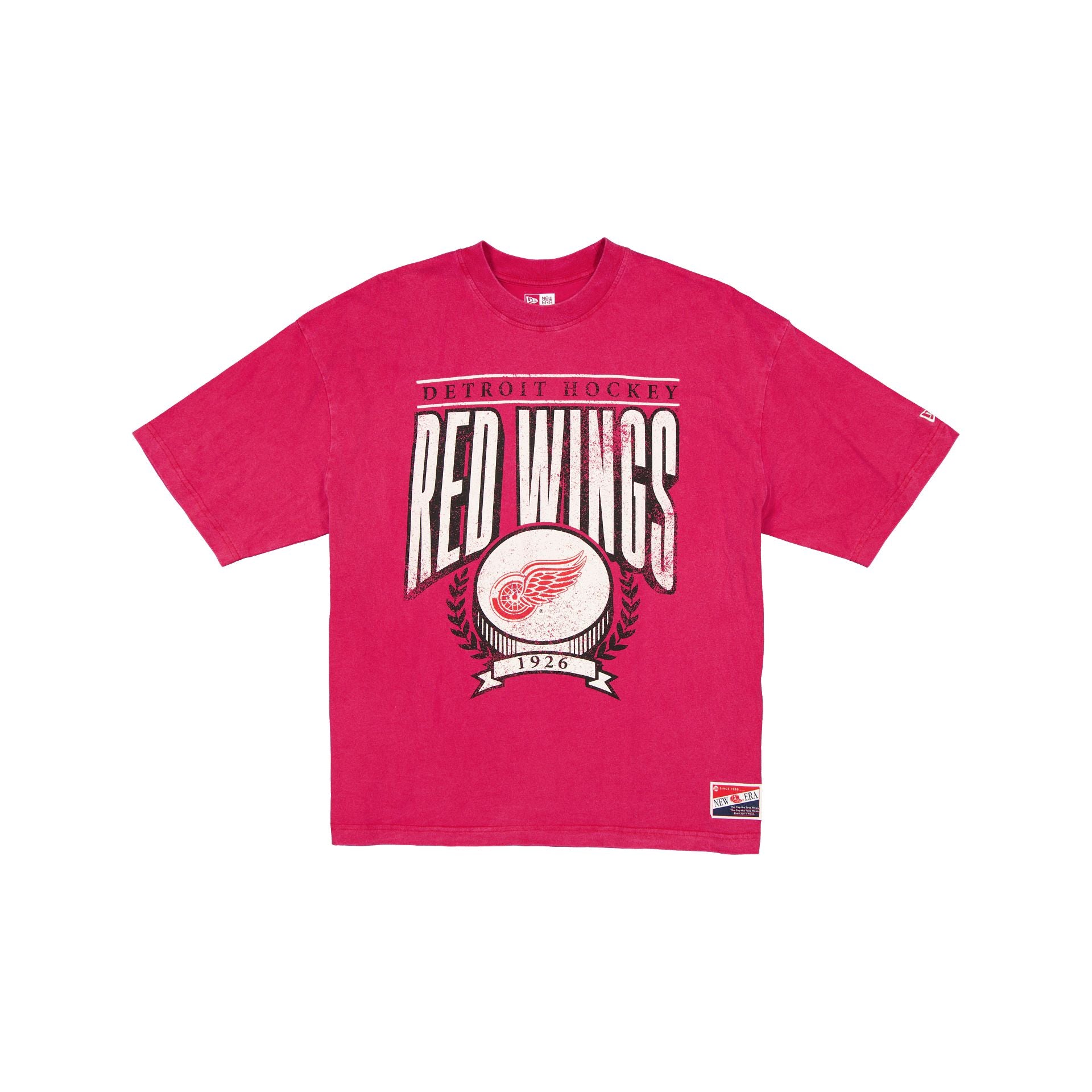 The Detroit Red Wings Throwback Boxy T-Shirt features a screen-printed Red Wings graphic at the front and a New Era jock tag at the left hip.