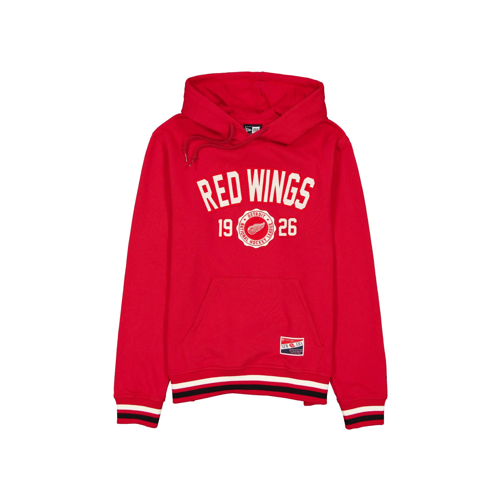 The Detroit Red Wings Throwback Hoodie features a felt applique Red Wings wordmark at the front with kangaroo pockets. adjustable drawstrings at the hood. and a New Era jock tag at the left pocket.