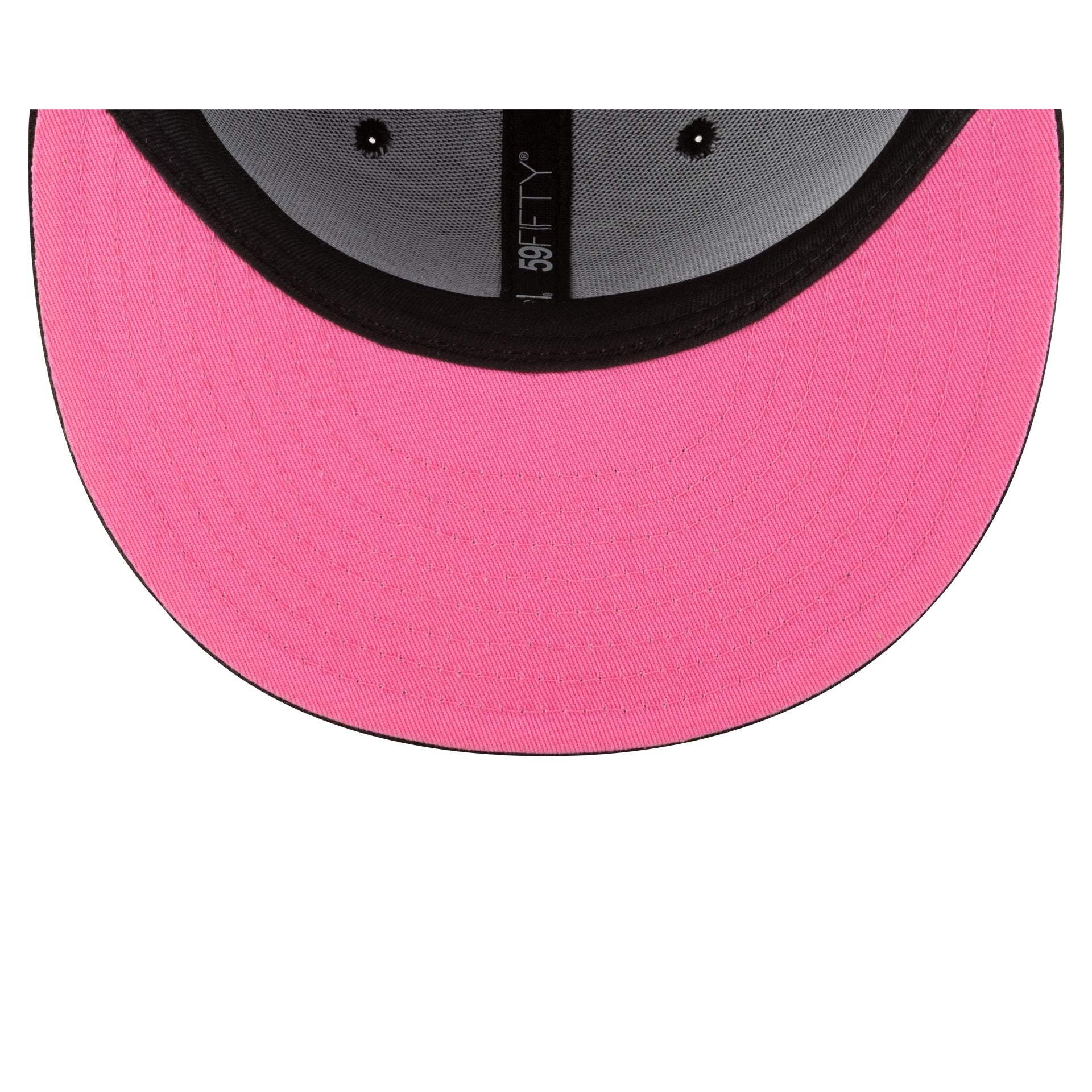 The Dominican Republic Black on Black 59FIFTY Fitted Cap features an embroidered DR monochromatic logo at the front panels with a matching team wordmark at the rear. Additional details include a pink screen-printed logo at the right-wear side and a pink undervisor.