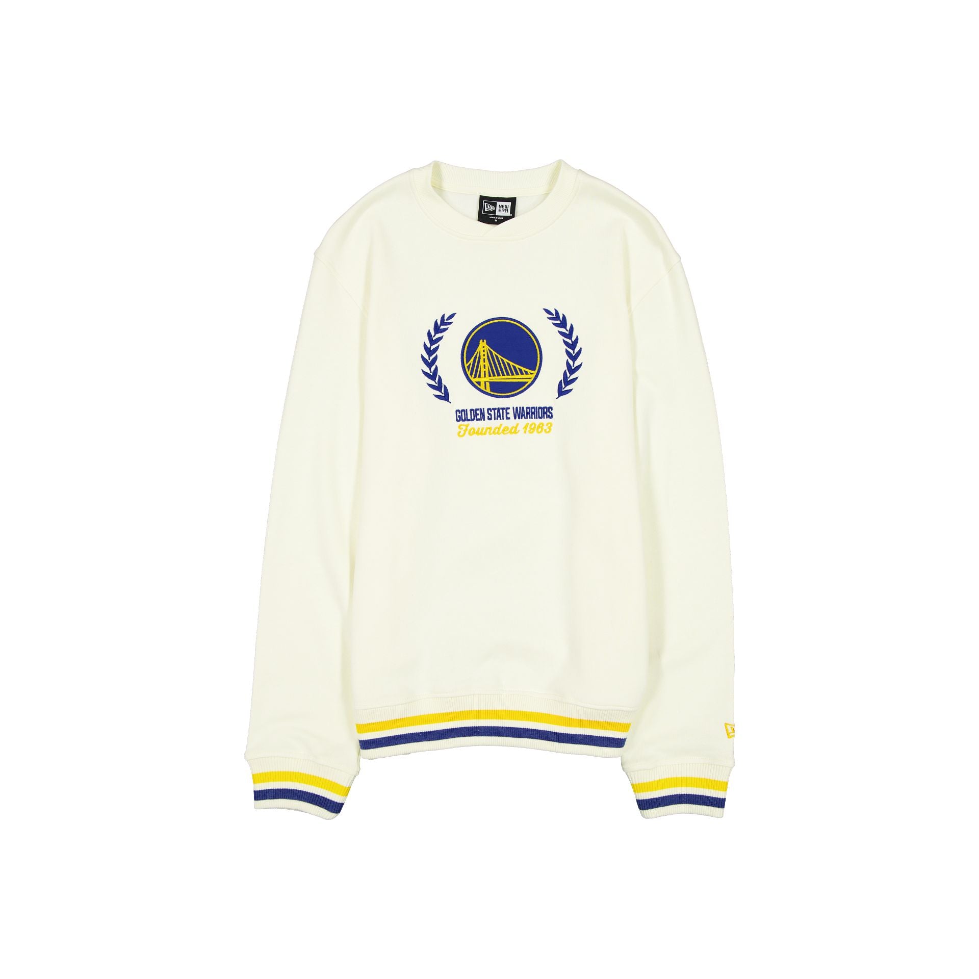 The Golden State Warriors Throwback Chrome White Crewneck features a twill applique Warriors logo and an embroidered wordmark at the front with a New Era jock tag at the left hip.