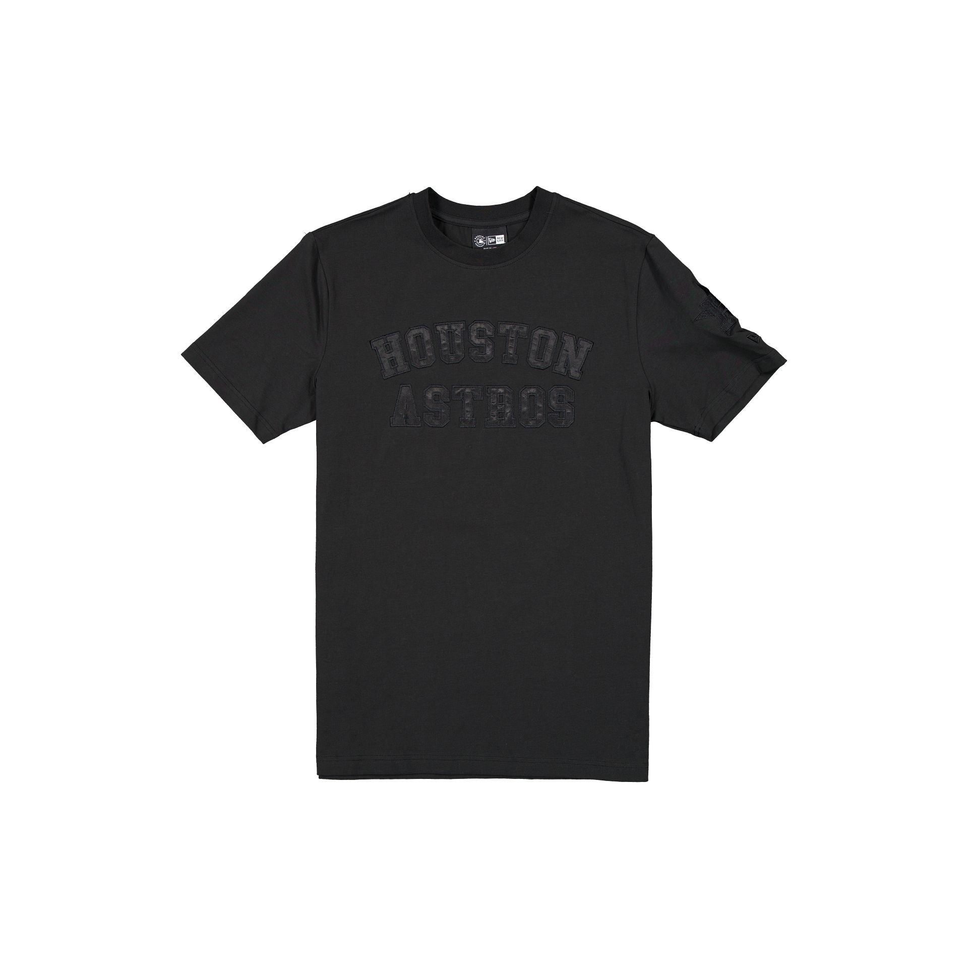 The Houston Astros Black on Black Logo Select T-Shirt features a satin applique with a tonal stitch Astros wordmark at the chest and an embroidered team logo at the left-wear sleeve.