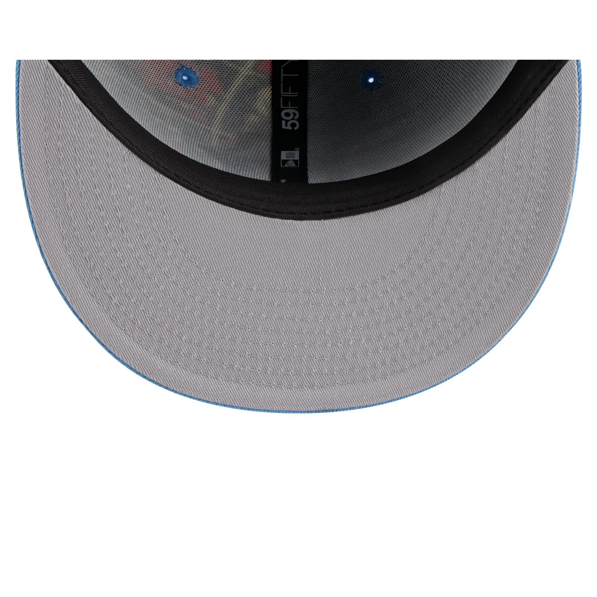 The Kansas City Royals Diamond Hero Edition 59FIFTY Fitted Cap features an embroidered Royals onomatopoeia pop logo at the front panels with baseball comic book prints at the front and back panel. Additional details include the MLB Batterman logo at the rear and a gray undervisor.