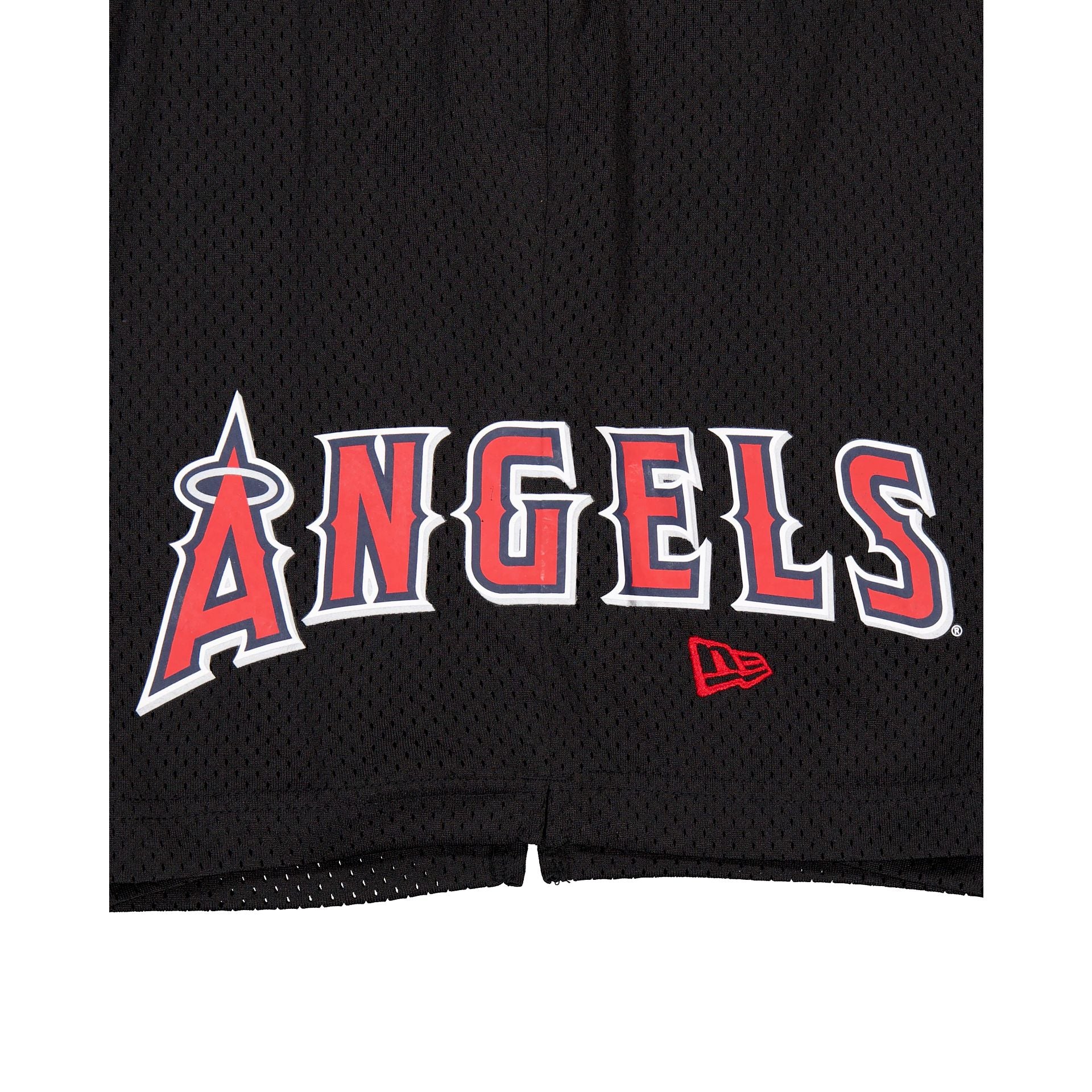 The Los Angeles Angels Mesh Shorts features a screen-printed Angels logo at the left leg with a team wordmark at the right leg.