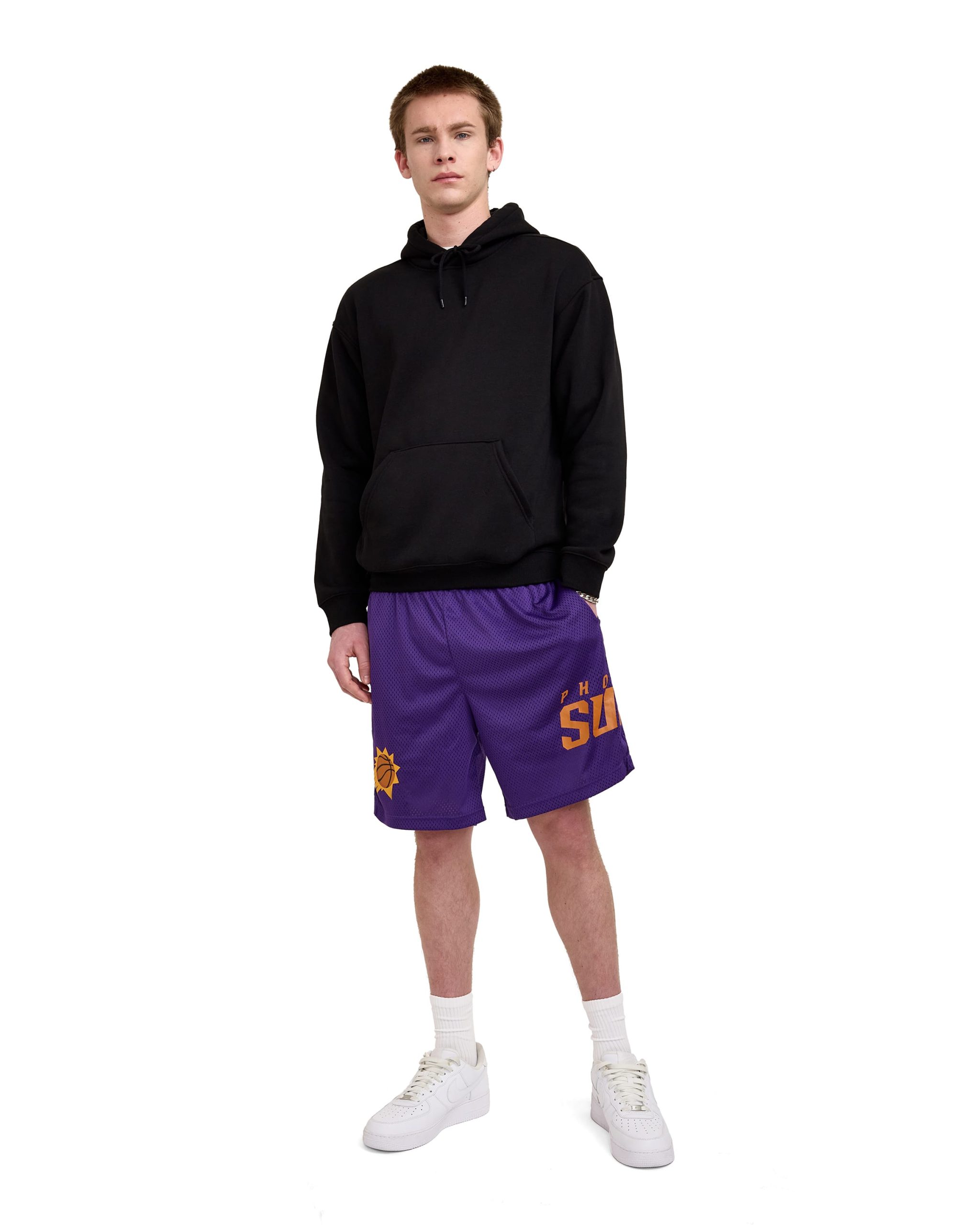 The Los Angeles Lakers Summer Shorts feature a screen-printed Lakers logo at the right leg and team wordmark on the left.