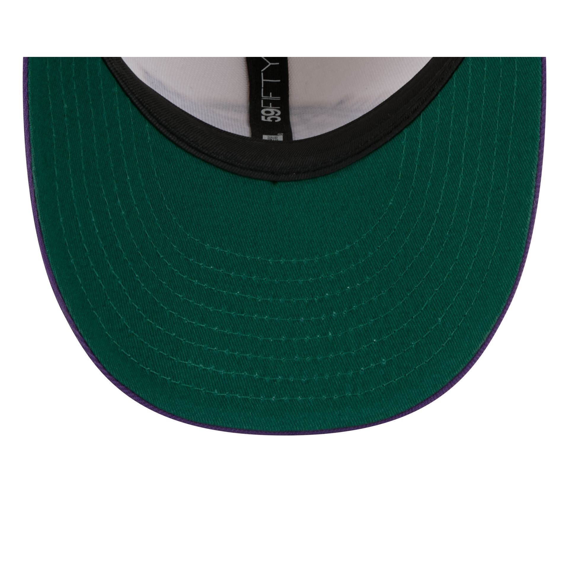 The Los Angeles Lakers Tonal Florals White Pre-Curved 59FIFTY Fitted Cap features an embroidered Lakers logo at the front panels with a team color visor and a green undervisor. Additional details include chainstitched embroidered flowers with handstitched beading at the left-wear side and a matching NBA Logoman at the rear.