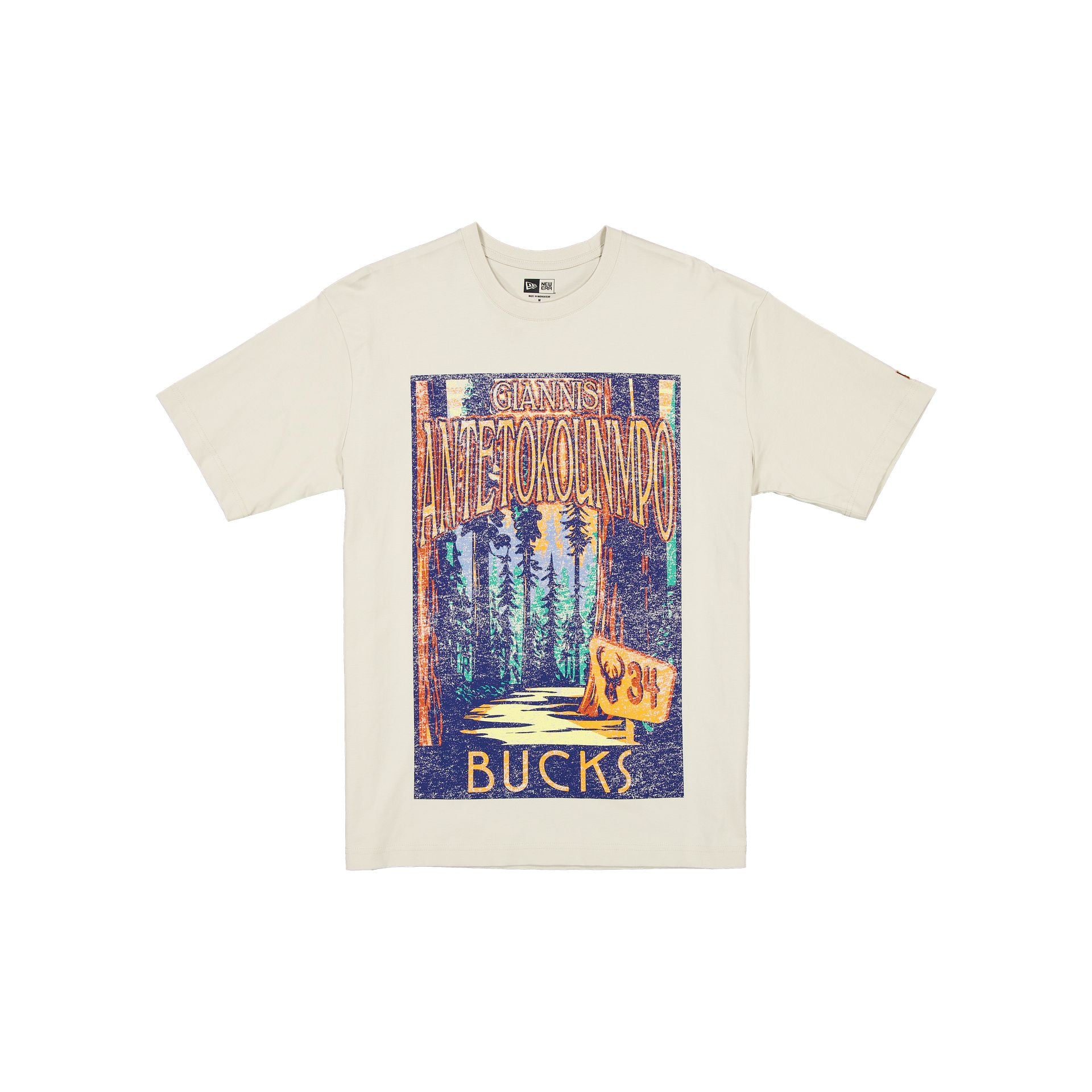 The Milwaukee Bucks 2025 All-Star Game Victory Grove Stone T-Shirt features a screen-printed Bucks player name and number at the front.