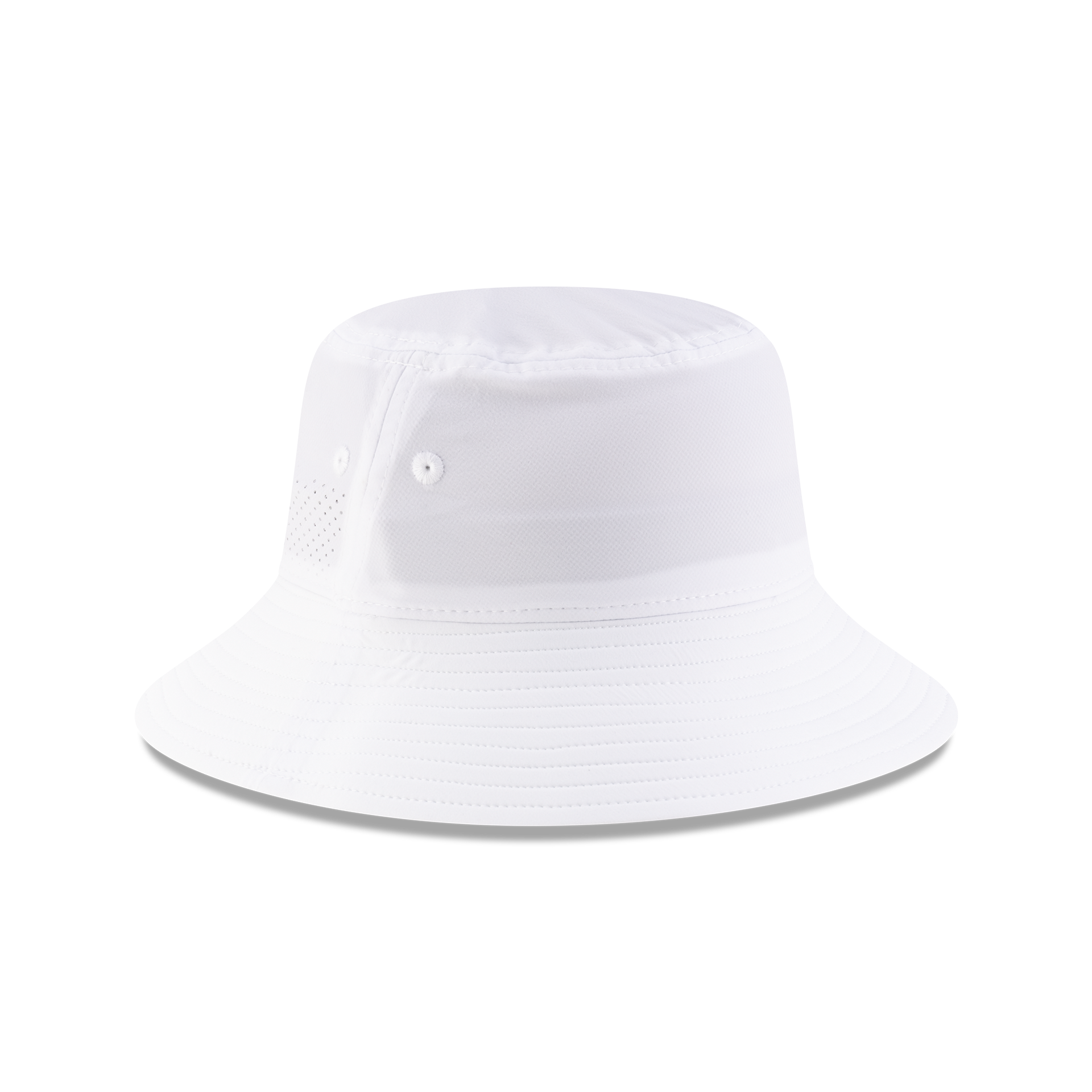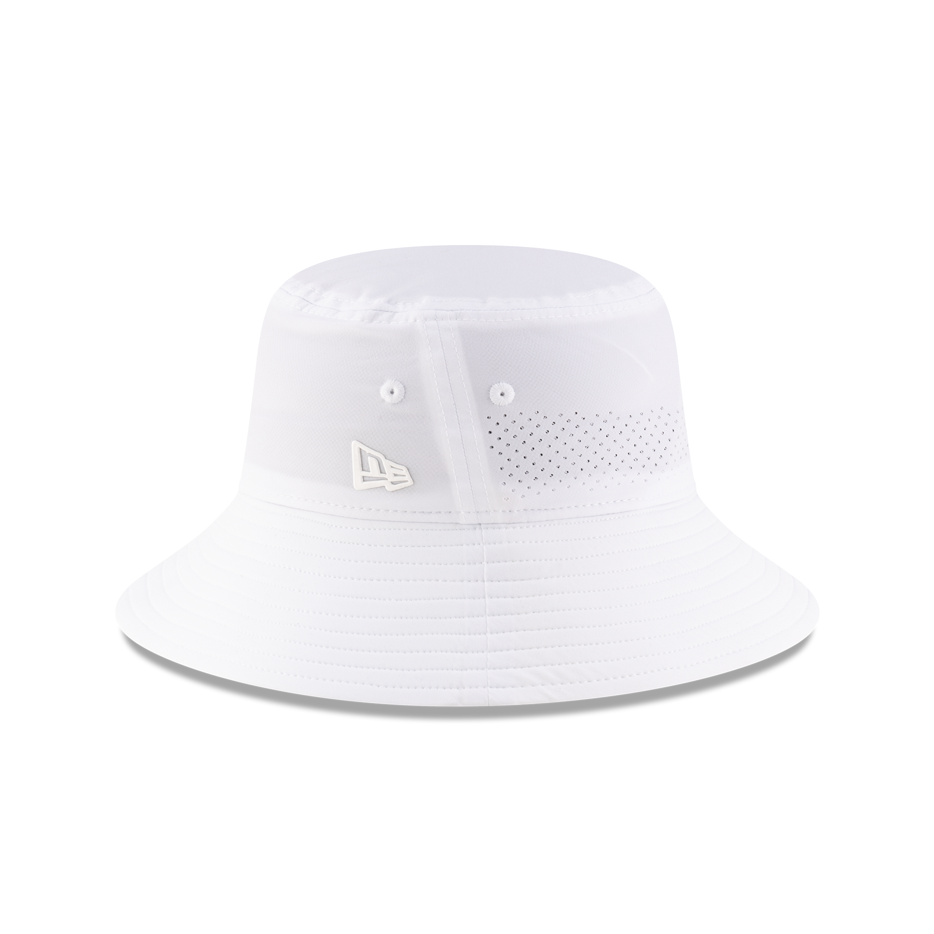 The New Era Branded White Golf Stretch Bucket Hat features: