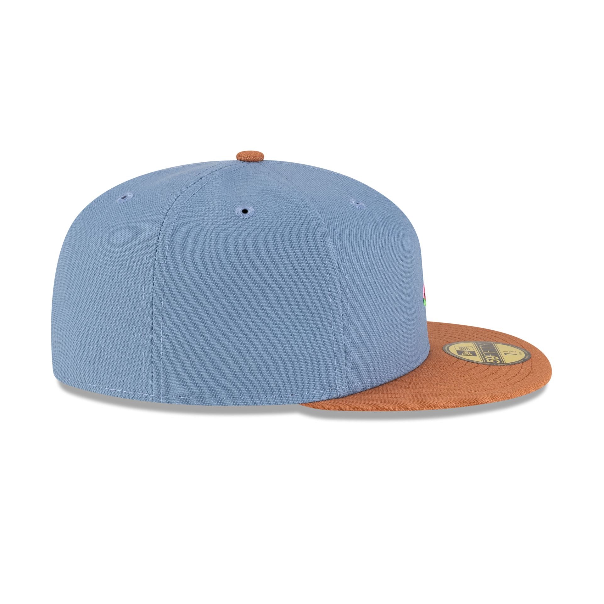 The New Era Cap Watermelon 59FIFTY Fitted Cap features an embroidered watermelon slice icon at the front panels with New Era Flag at the left-wear side. a brown visor. and a gray undervisor.