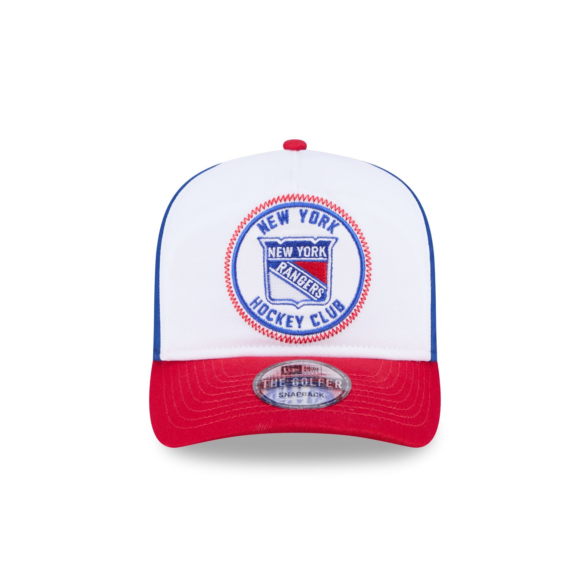 The New York Rangers NHL Pack Golfer features a Rangers Hockey Club patch at the front panel with a matching NHL Shield at the right of a snapback closure at the rear and a gray undervisor.