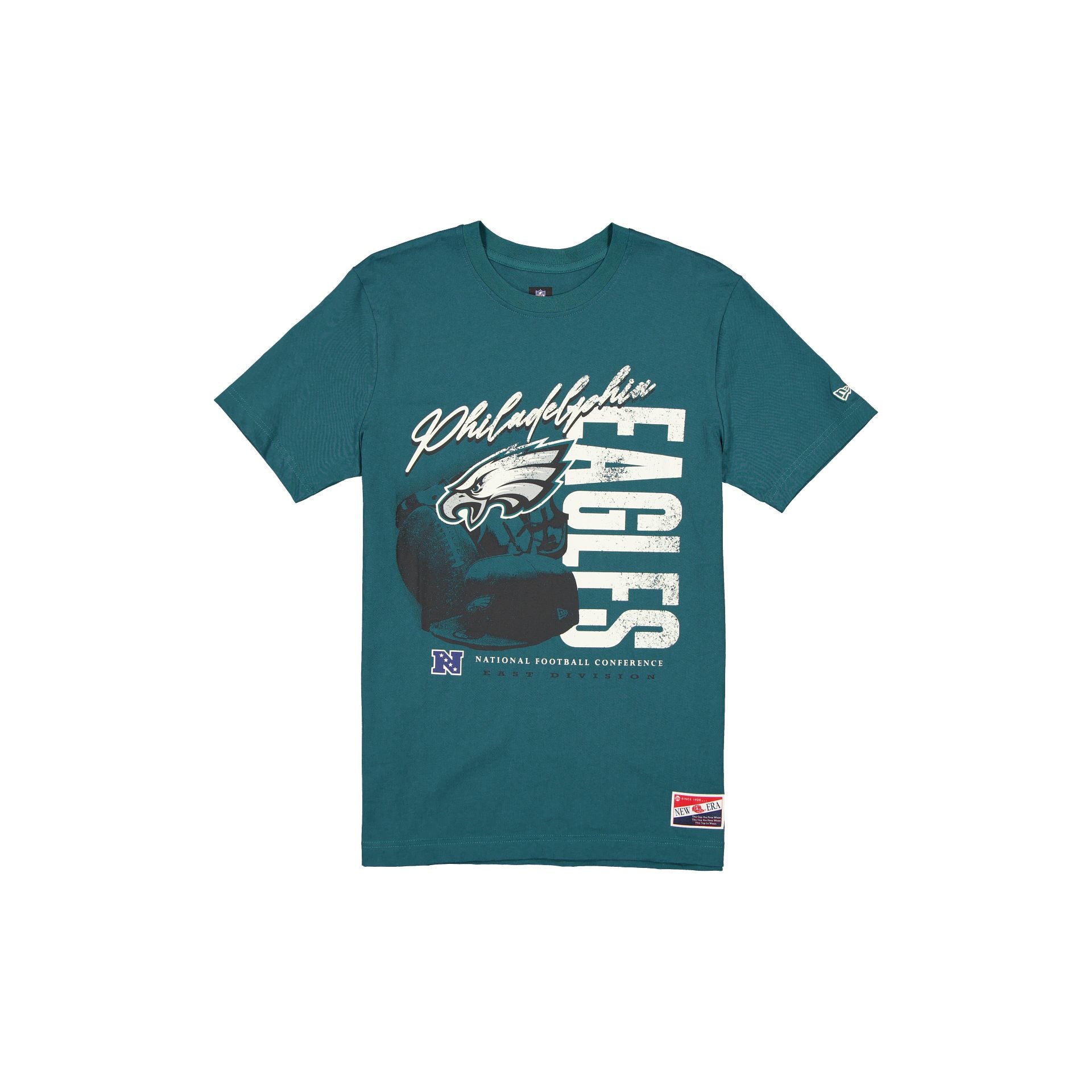 The Philadelphia Eagles Throwback T-Shirt features a screen-printed Eagles graphic at the front and a New Era jock tag at the left hip.