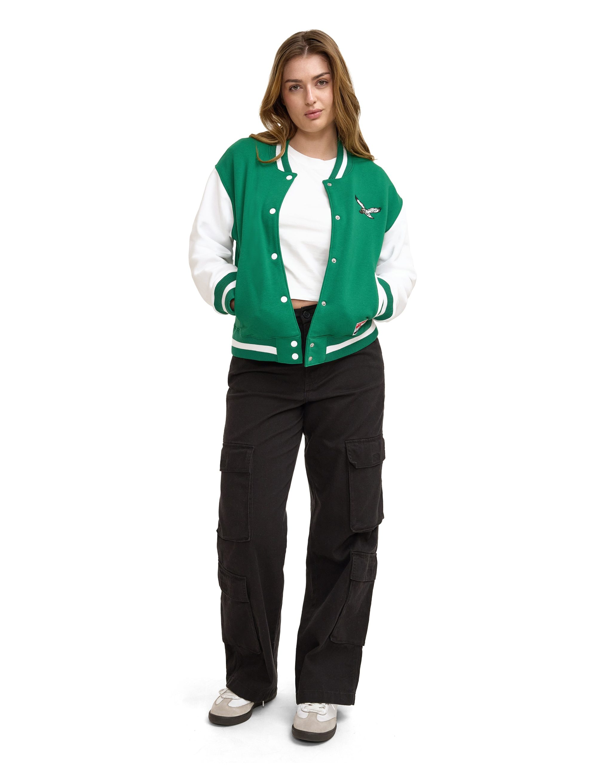 The Philadelphia Flyers Throwback Fleece Women’s Jacket features a chenille applique Flyers logo at the left chest with a snap button closure and a screen-printed team wordmark at the rear.