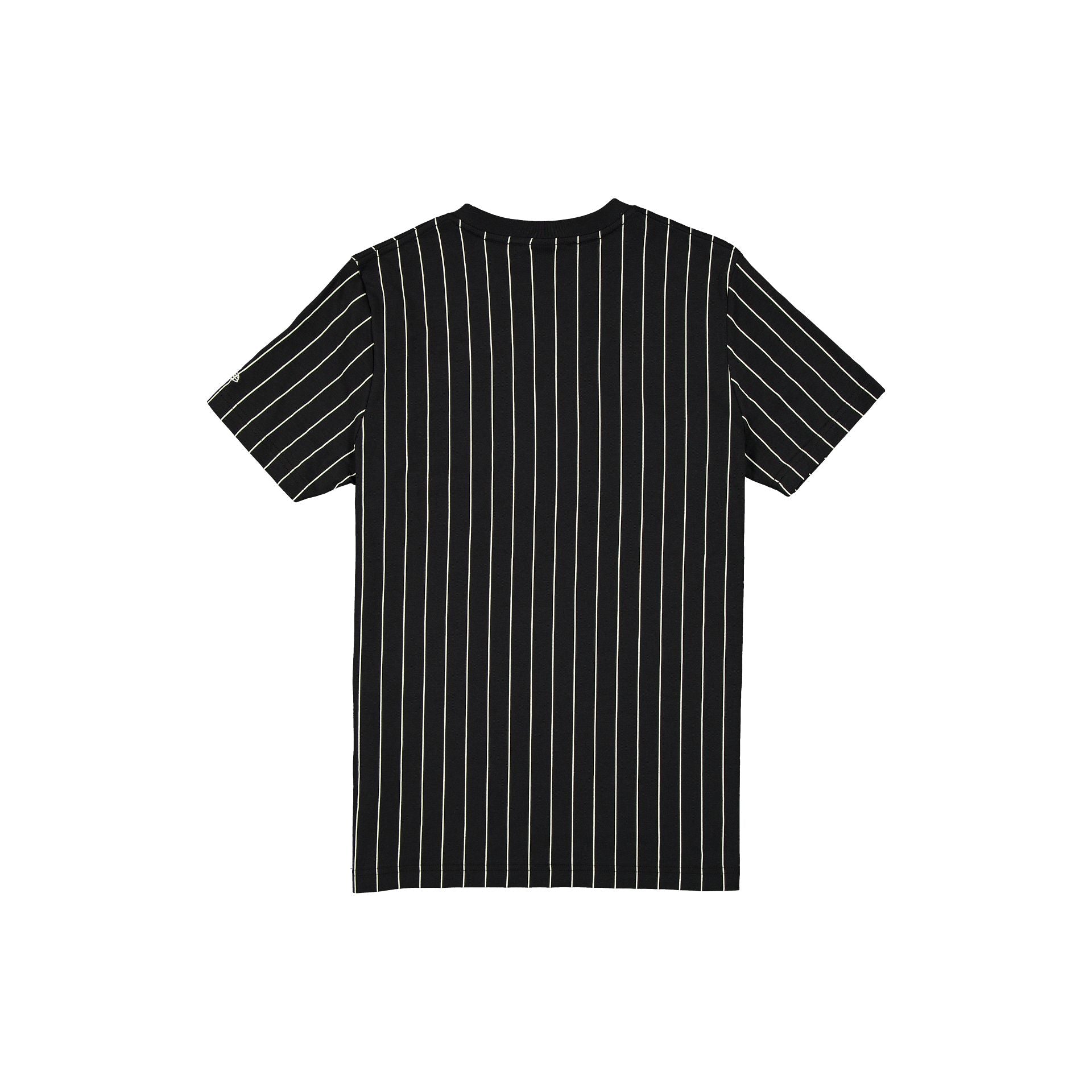 The Pittsburgh Pirates Throwback Pinstripe Wordmark T-Shirt features a twill applique Pirates wordmark and logo at the front with a New Era jock tag at the left hip.