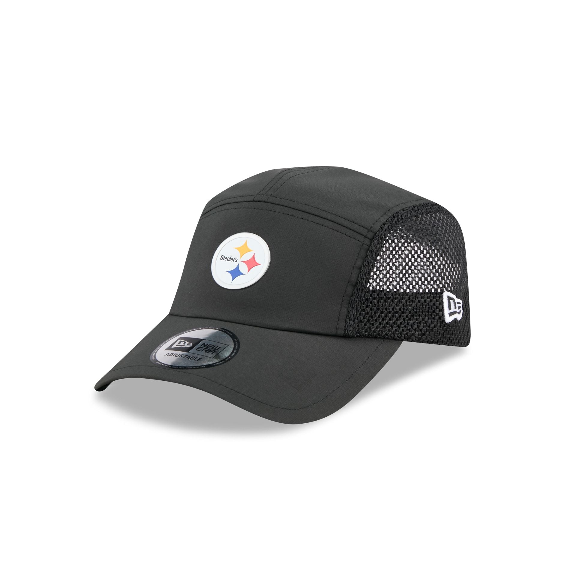 The Pittsburgh Steelers Poly Runner Cap features a heat sealed Steelers logo at the front panels with mesh side panels. Additional details include a silicone patch above an adjustable drawstring closure at the rear.