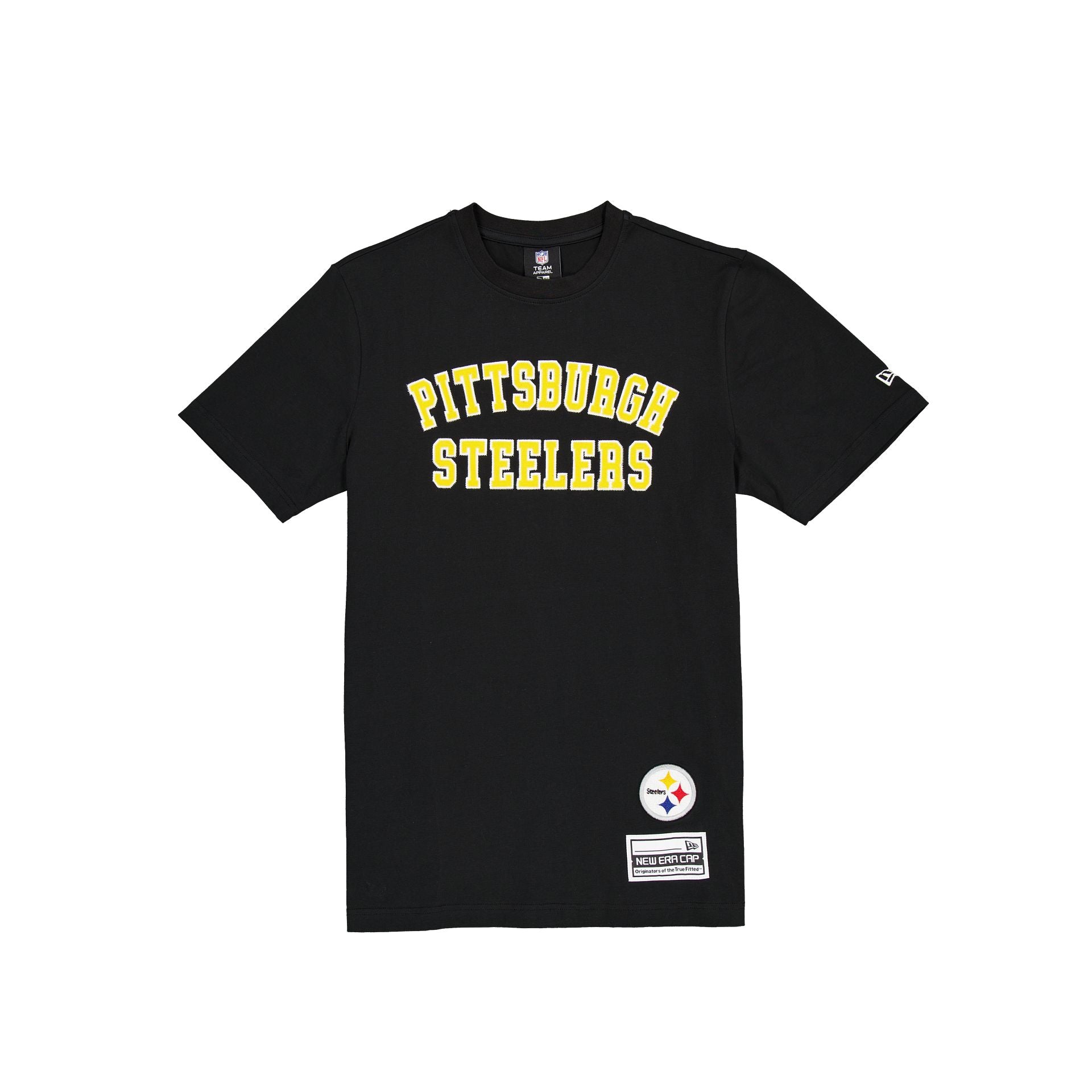 The Pittsburgh Steelers Team Color Logo Select T-Shirt features a zig zag stitched twill applique Steelers wordmark at the chest with an embroidered team logo above a New Era Cap jock tag at the left hip.