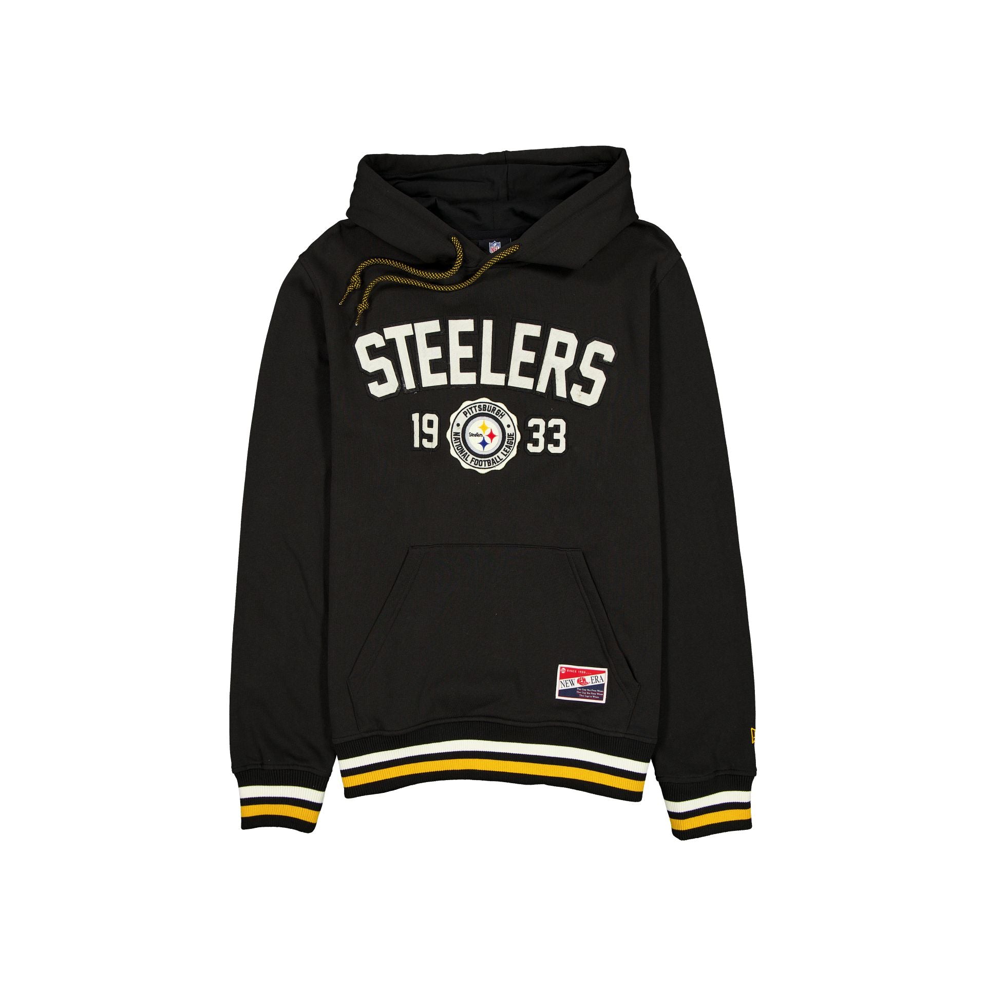 The Pittsburgh Steelers Throwback Hoodie features a felt applique Steelers wordmark at the front with kangaroo pockets. adjustable drawstrings at the hood. and a New Era jock tag at the left pocket.