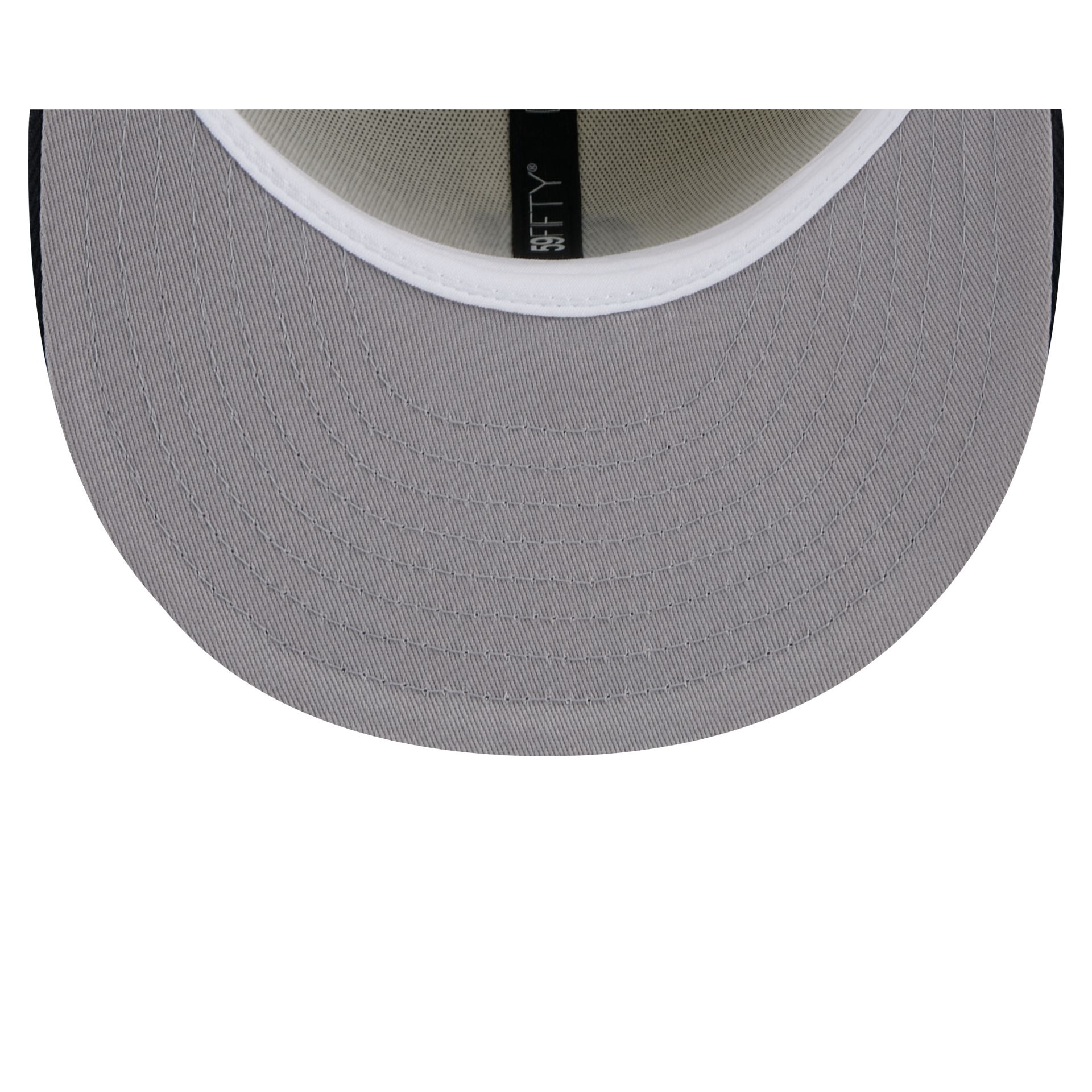 The Seattle Mariners Chrome 59FIFTY Fitted Cap features an embroidered Mariners logo at the front panels with a matching MLB Batterman logo at the rear. a navy visor. and a gray undervisor.