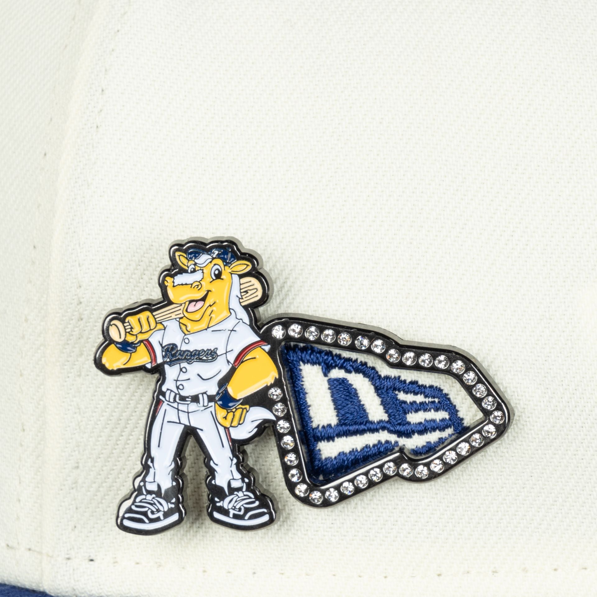 The Texas Rangers Mascot Pin 59FIFTY Fitted Cap features an embroidered Rangers logo at the front panels with a matching MLB Batterman logo at the rear. Additional details include a team mascot pin at the left-wear side. a 40th Anniversary patch at the right-wear side. and a gray undervisor.