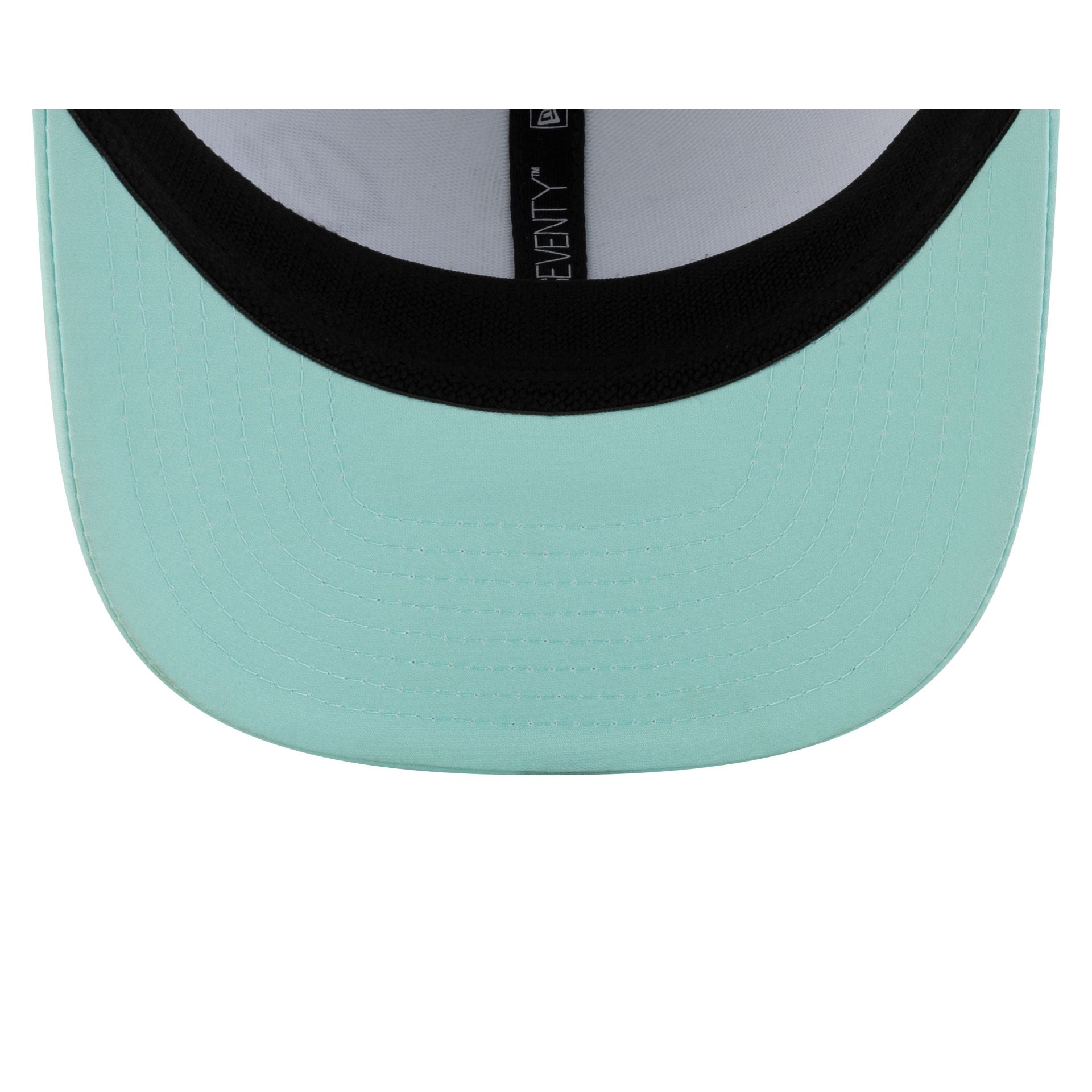 The 2025 Miami Race Special MoneyGram Haas F1 Team 9SEVENTY Stretch-Snap features a silicone logo at the front left panels with a Haas Miami patch at the right-wear side. Additional details a snapback closure at a patterned rear and a mint blue undervisor.