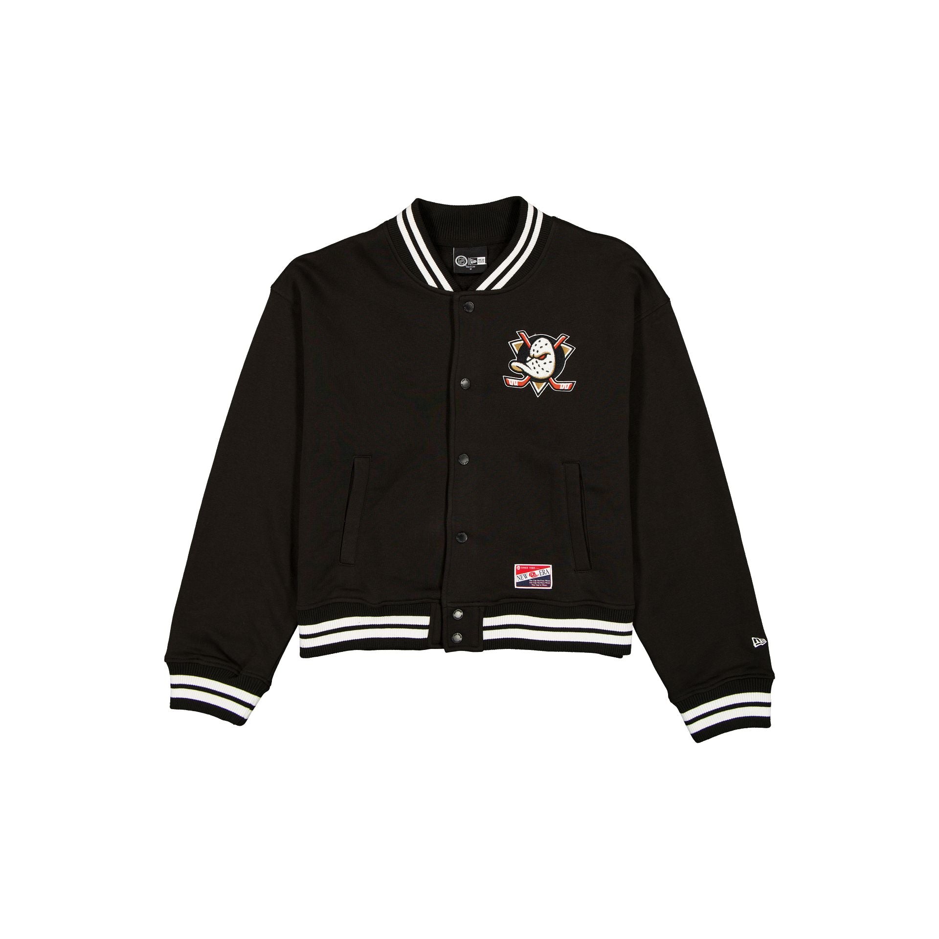 The Anaheim Ducks Throwback Women’s Snap Front Jacket features a chenille Ducks logo at the left chest a snap button closure and front pockets.