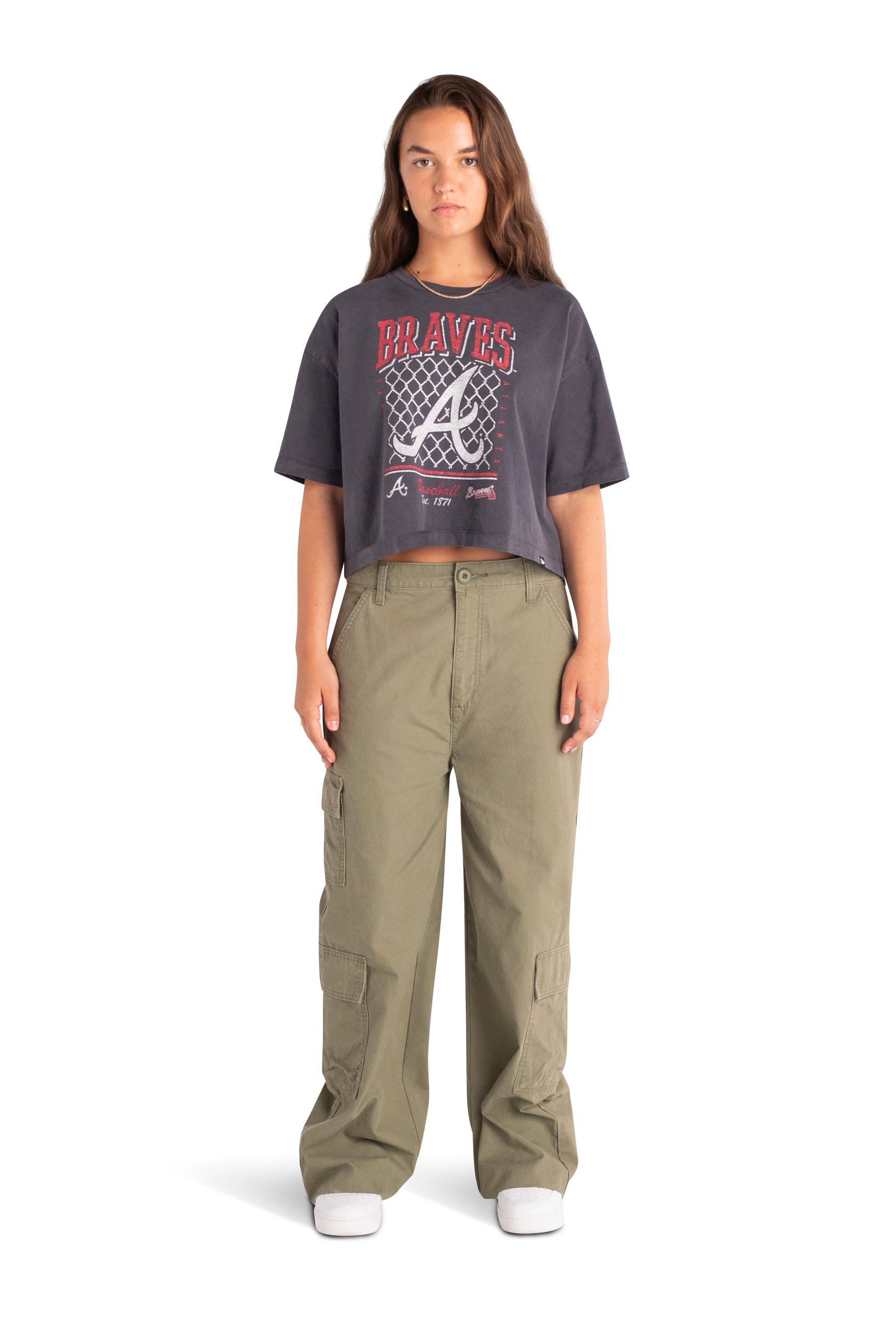 The Atlanta Braves Old School Sport Women’s T-Shirt features a distressed screen-printed Braves graphic at the front.
