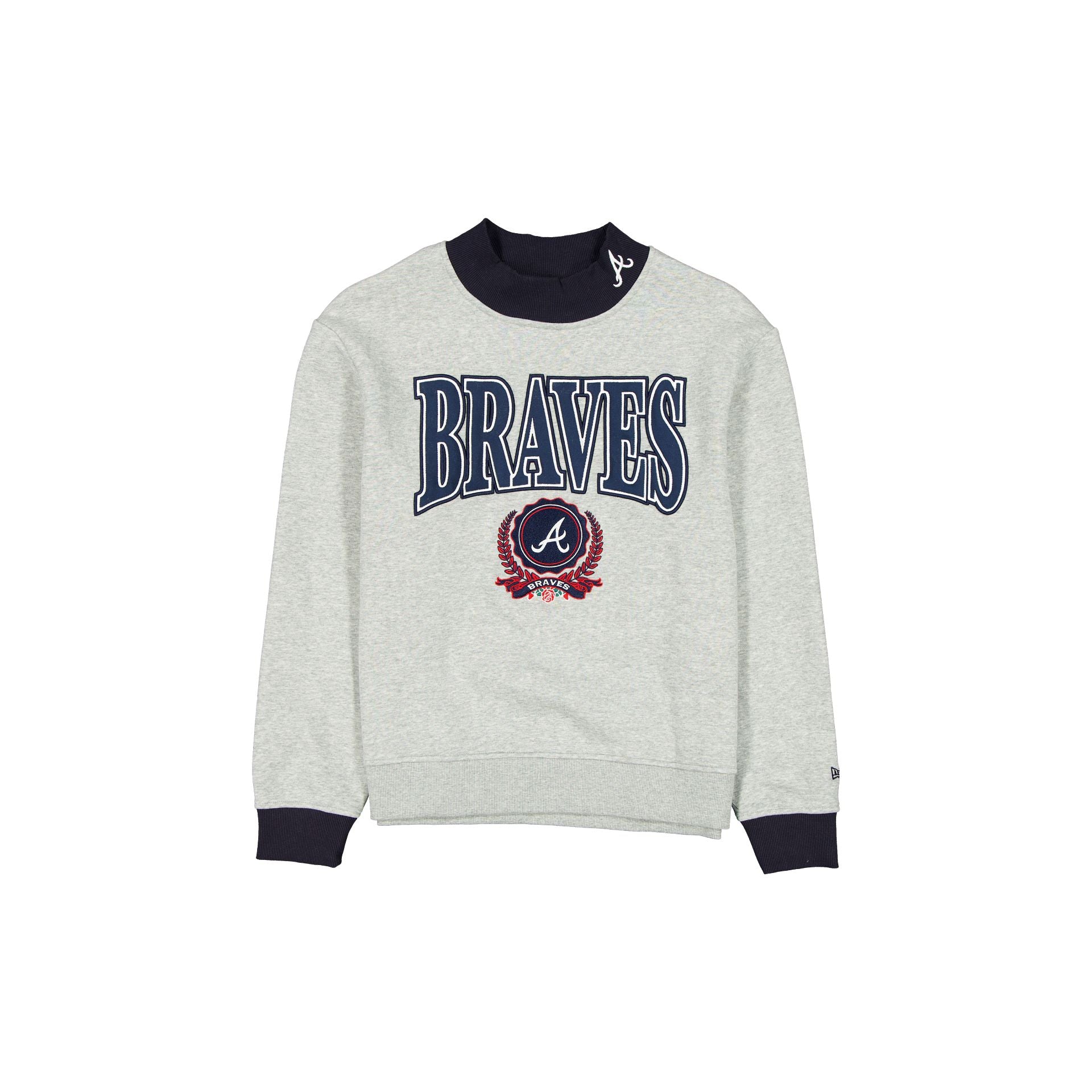The Atlanta Braves Throwback Prep Women’s Mockneck Sweatshirt features an embroidered Braves wordmark above a team emblem at the front with a matching logo at the neckline.
