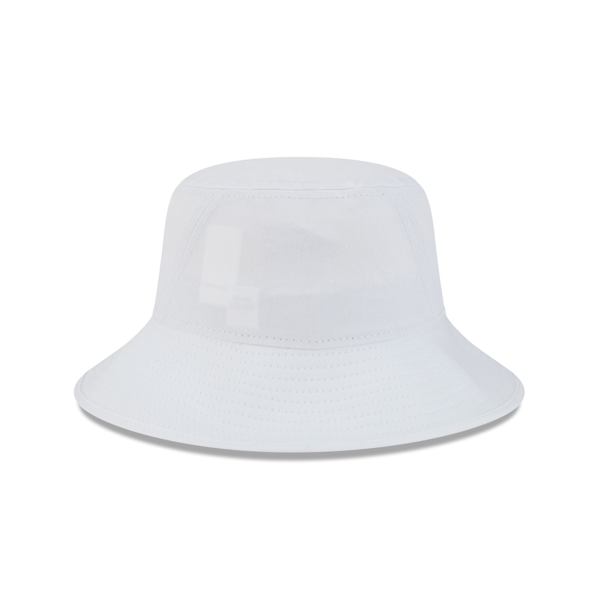 The Atlanta Dream Optic White Bucket Hat features an embroidered Dream logo at the front with a matching New Era Flag at the left-wear side.