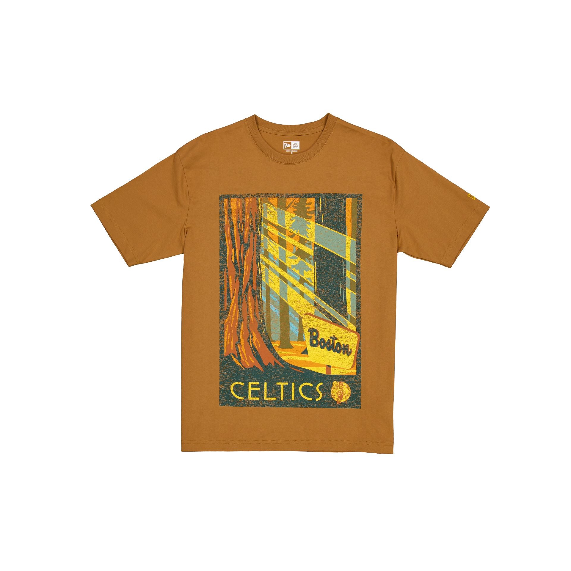 The Boston Celtics 2025 All-Star Game Victory Grove Light Bronze T-Shirt features a screen-printed Celtics forest graphic at the front.