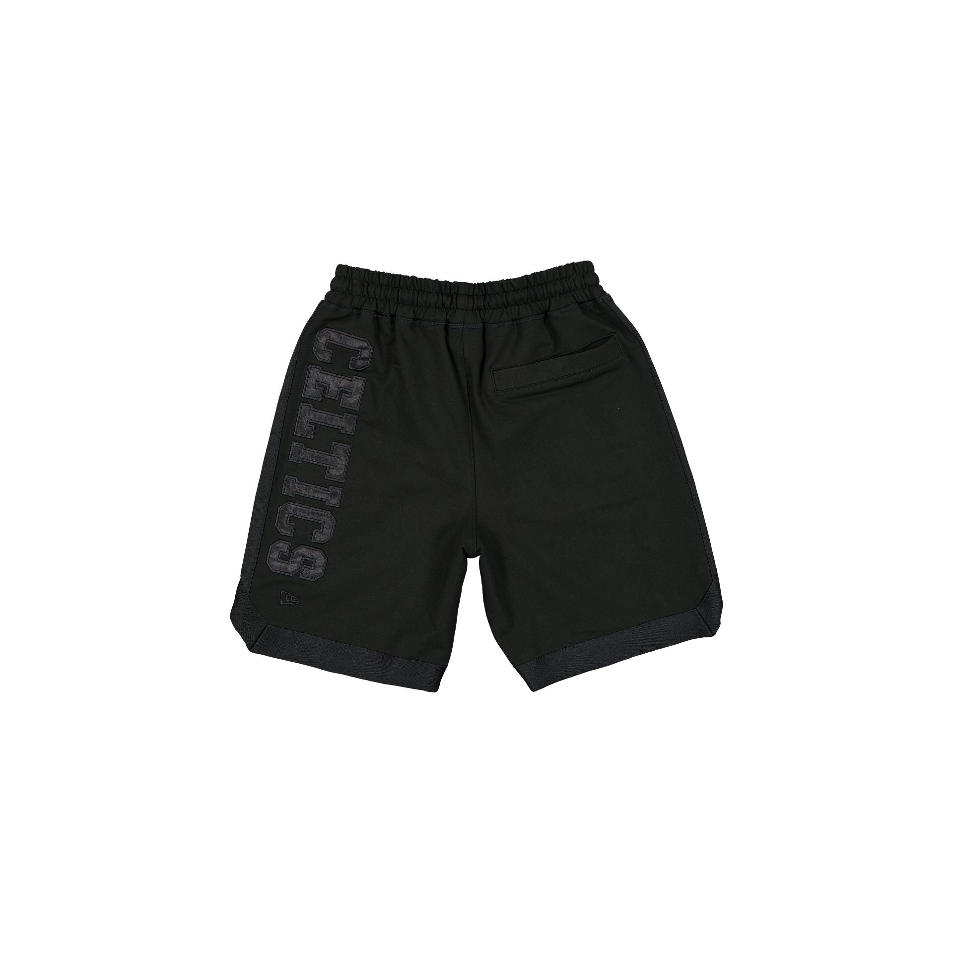 The Boston Celtics Black on Black Logo Select Shorts features an embroidered Celtics logo at the right-wear leg and a satin applique with a tonal stitch team wordmark at the rear left leg.