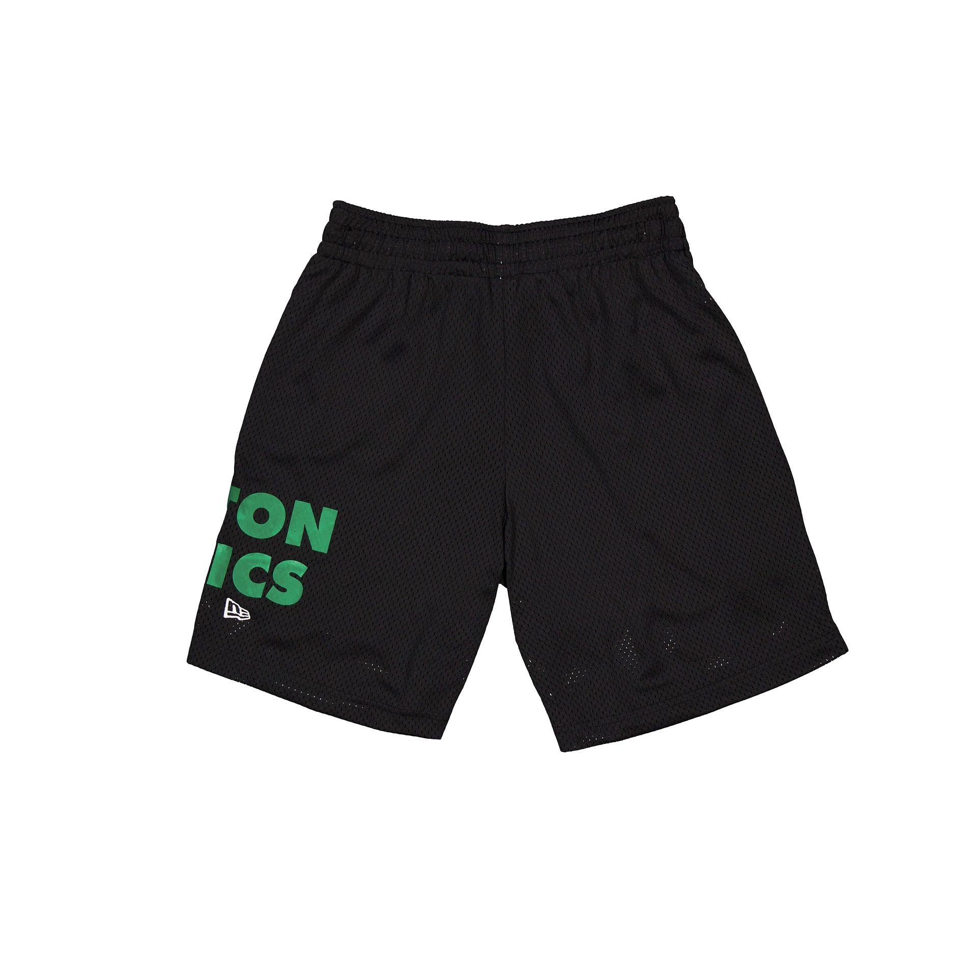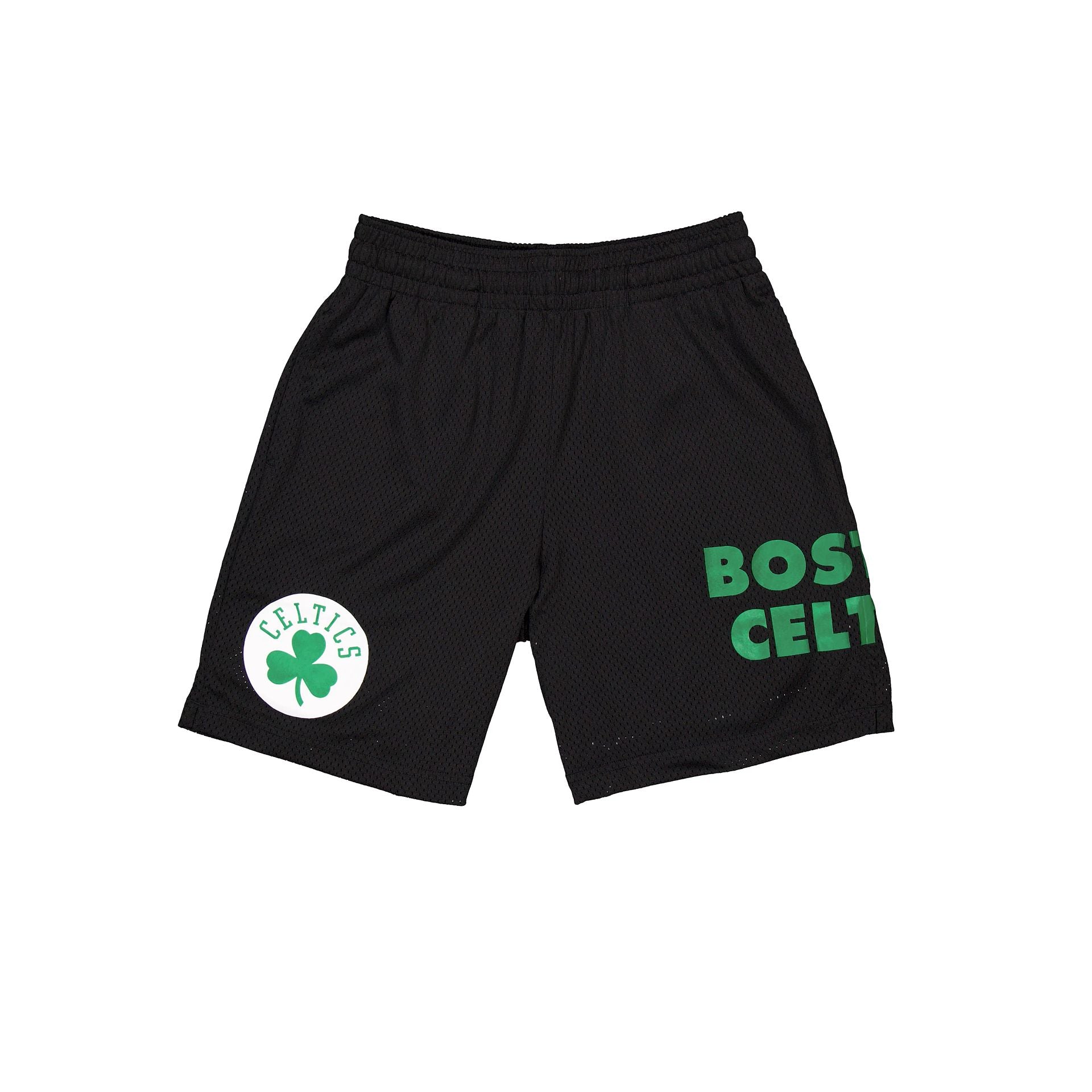 The Boston Celtics Mesh Shorts features a screen-printed Celtics logo at the left leg with a team wordmark at the right leg.