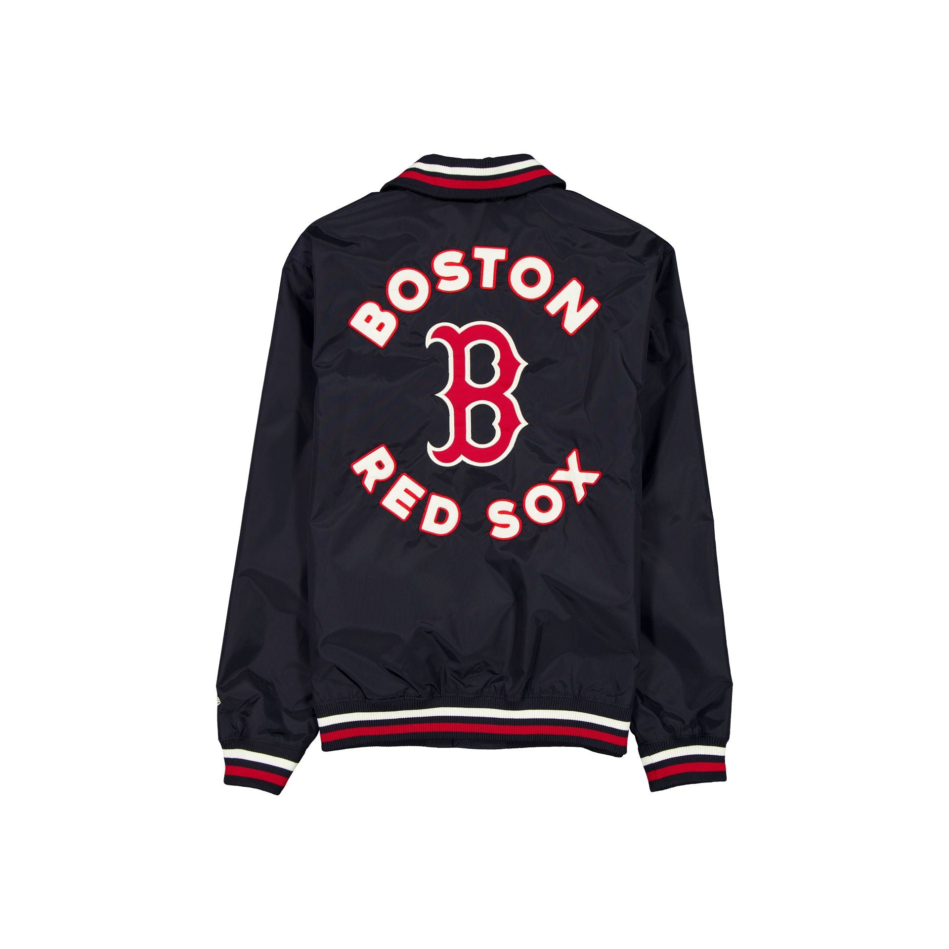 The Boston Red Sox Throwback Jacket features an embroidered Red Sox logo at the left chest with a logo and wordmark at the rear. Additional details include pockets. a button closure. and a New Era jock tag at the left hip.