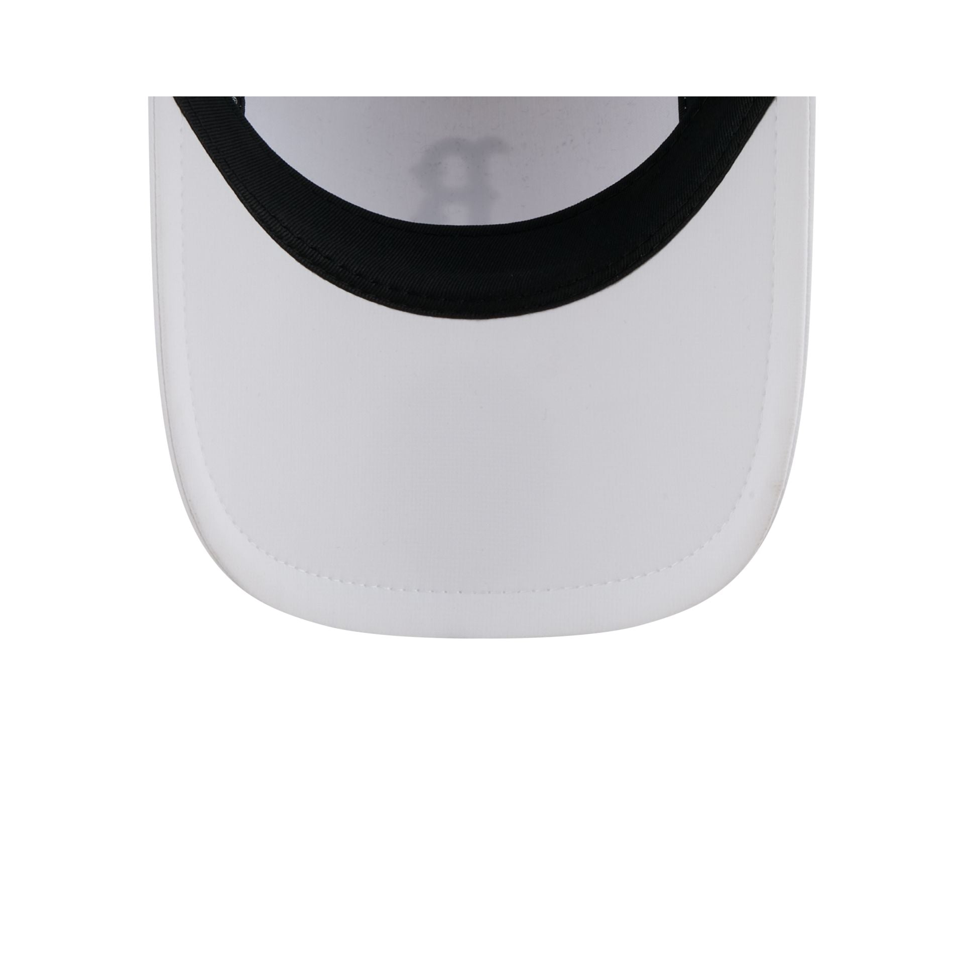The Boston Red Sox White Poly Runner Cap features a heat sealed Red Sox logo at the front panels with mesh side panels. Additional details include a silicone patch above an adjustable drawstring closure at the rear.