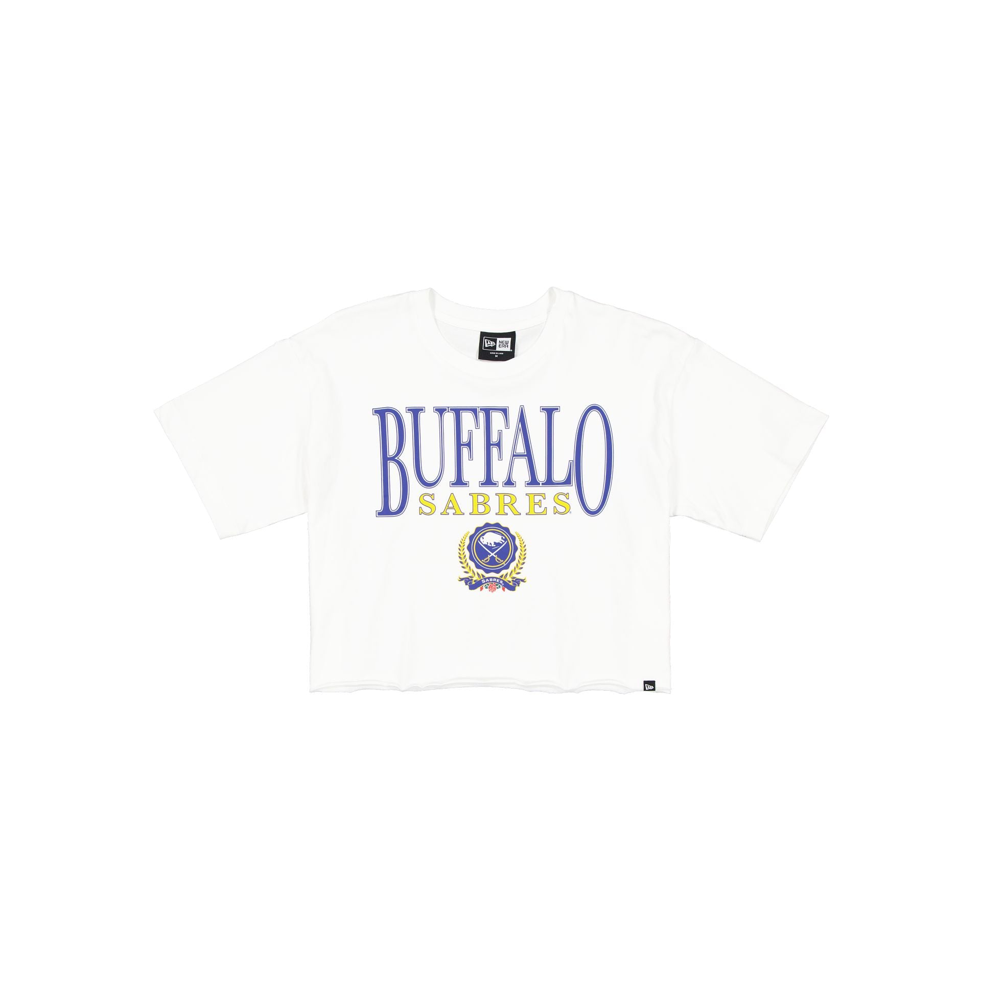 The Buffalo Sabres Throwback Prep Women’s Cropped T-Shirt features a screen-printed Sabres wordmark above a team emblem at the front.