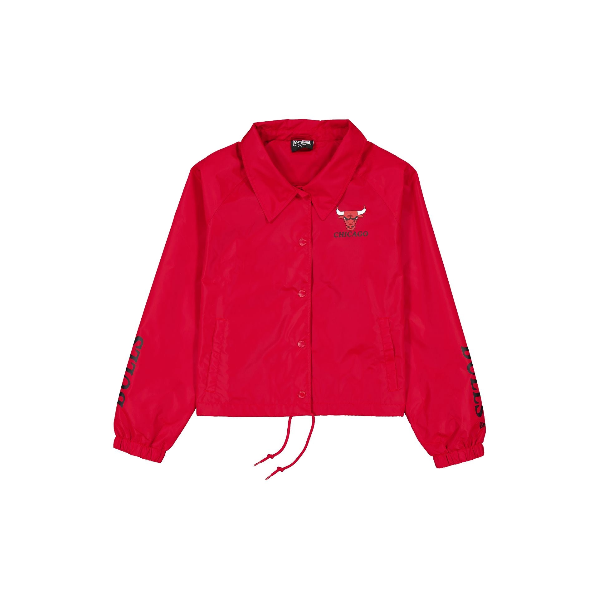 The Chicago Bulls Game Day Women’s Jacket features a screen-printed Bulls logo at the left chest with a wordmark at each sleeve. Additional details include a button closure. pockets. and adjustable drawstrings at the waist.