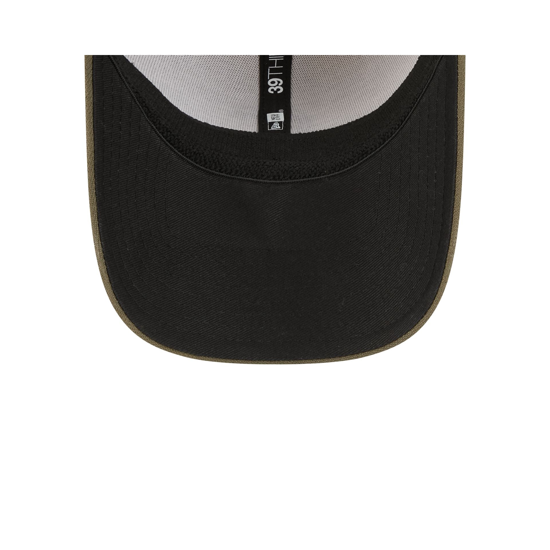 The Chicago Cubs Armed Forces Day 2025 39THIRTY Stretch Fit Cap features an embroidered Cubs logo at the front panels with a team wordmark at the rear. Additional details include the American Flag embroidered at the right-wear side and a black undervisor.