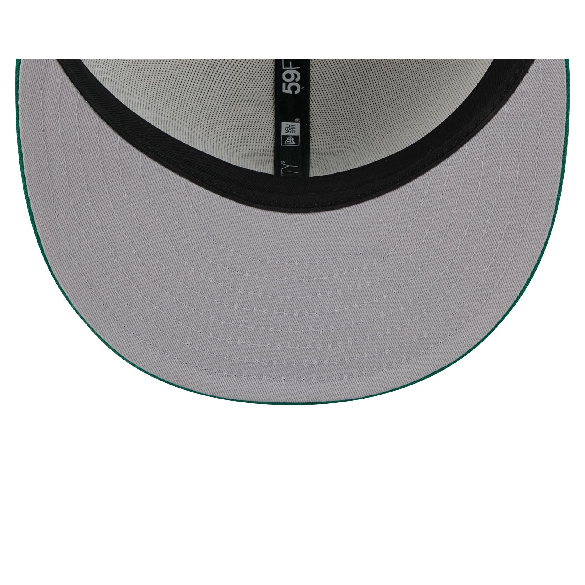 The Chicago Cubs Beaded Linen 59FIFTY Fitted Cap features a red. white and green beaded Cubs logo at the front panels with a matching MLB Batterman logo at the rear. Additional details include an embroidered team wordmark at the right-wear side with a green visor and a gray undervisor.