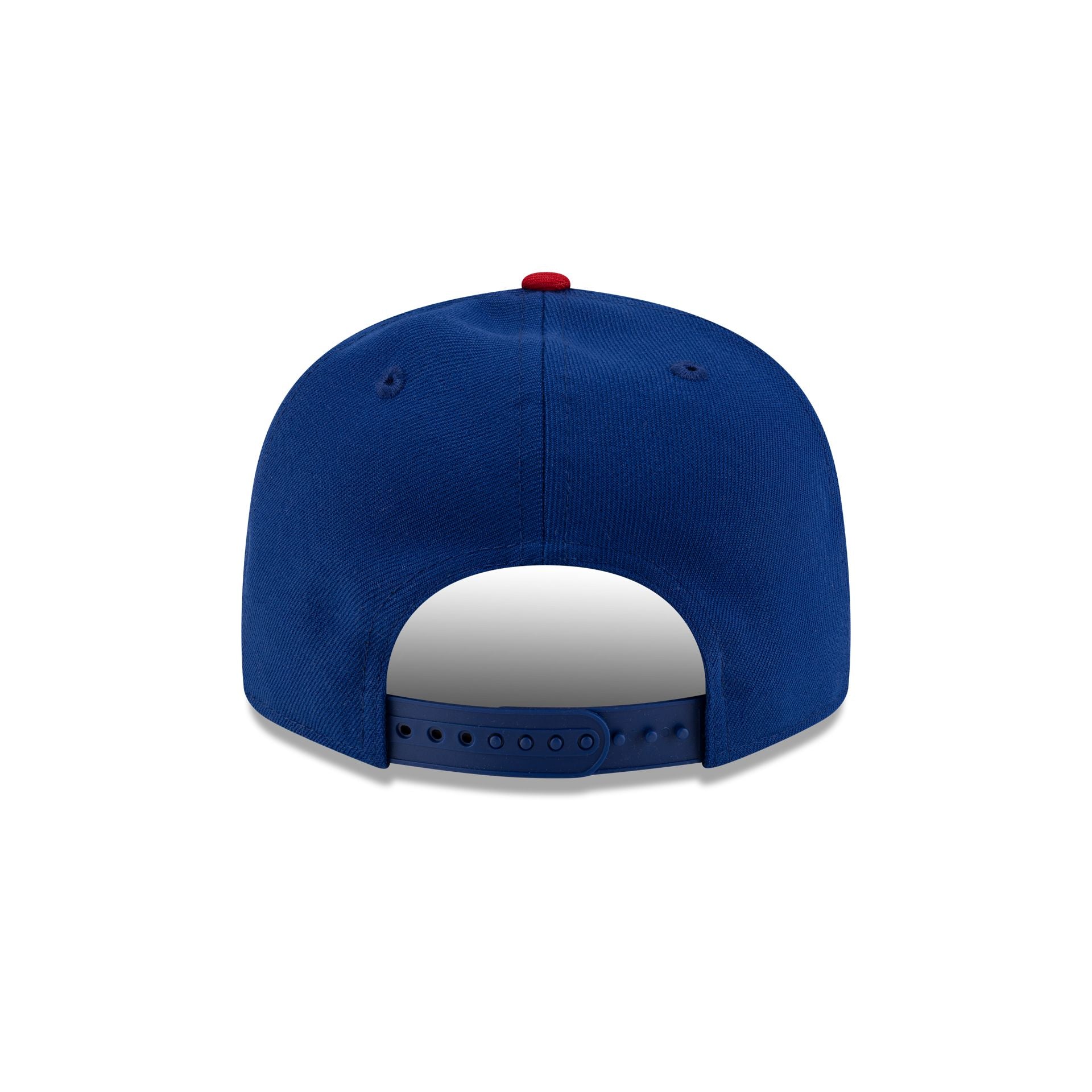 The Chicago Cubs Mascot Blue 9FIFTY Snapback features an embroidered Cubs mascot at the front panels with a Wrigley Field patch at the right-wear side. Additional details include a snapback closure at the rear and a gray undervisor.