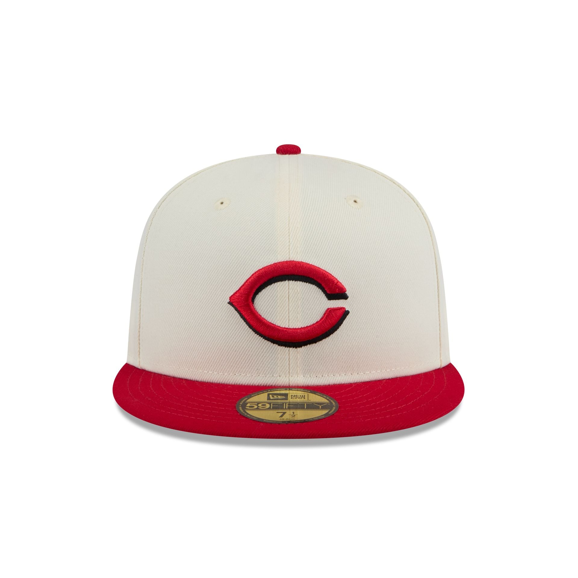 The Cincinnati Reds Chrome 59FIFTY Fitted Cap features an embroidered Reds logo at the front panels with a matching MLB Batterman logo at the rear. a red visor. and a gray undervisor.
