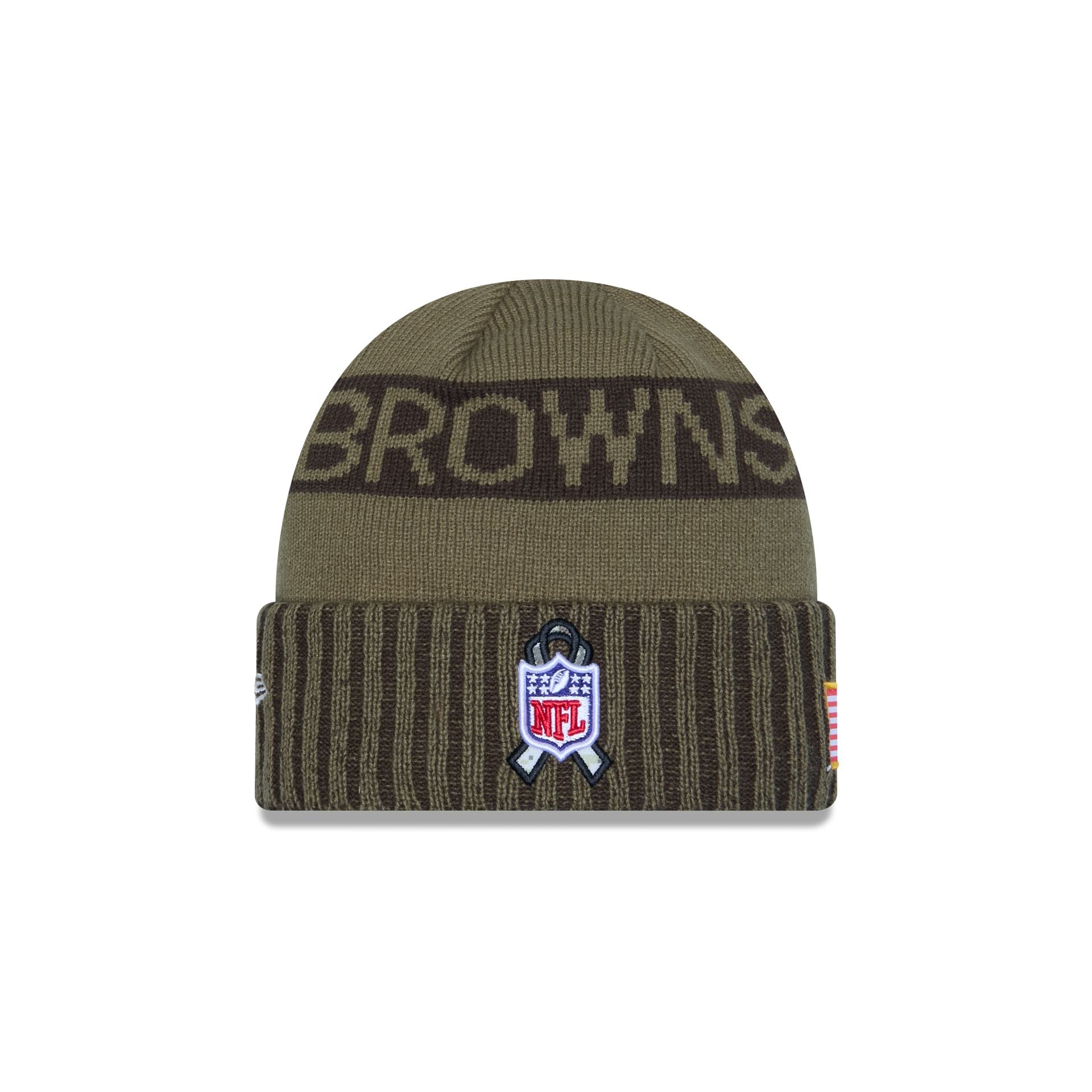 The Cleveland Browns 2025 Salute to Service Cuff Knit features an embroidered Browns logo at the front with a team wordmark at the crown. an American flag patch at the right-wear side. and the official NFL Salute to Service patch at the rear.