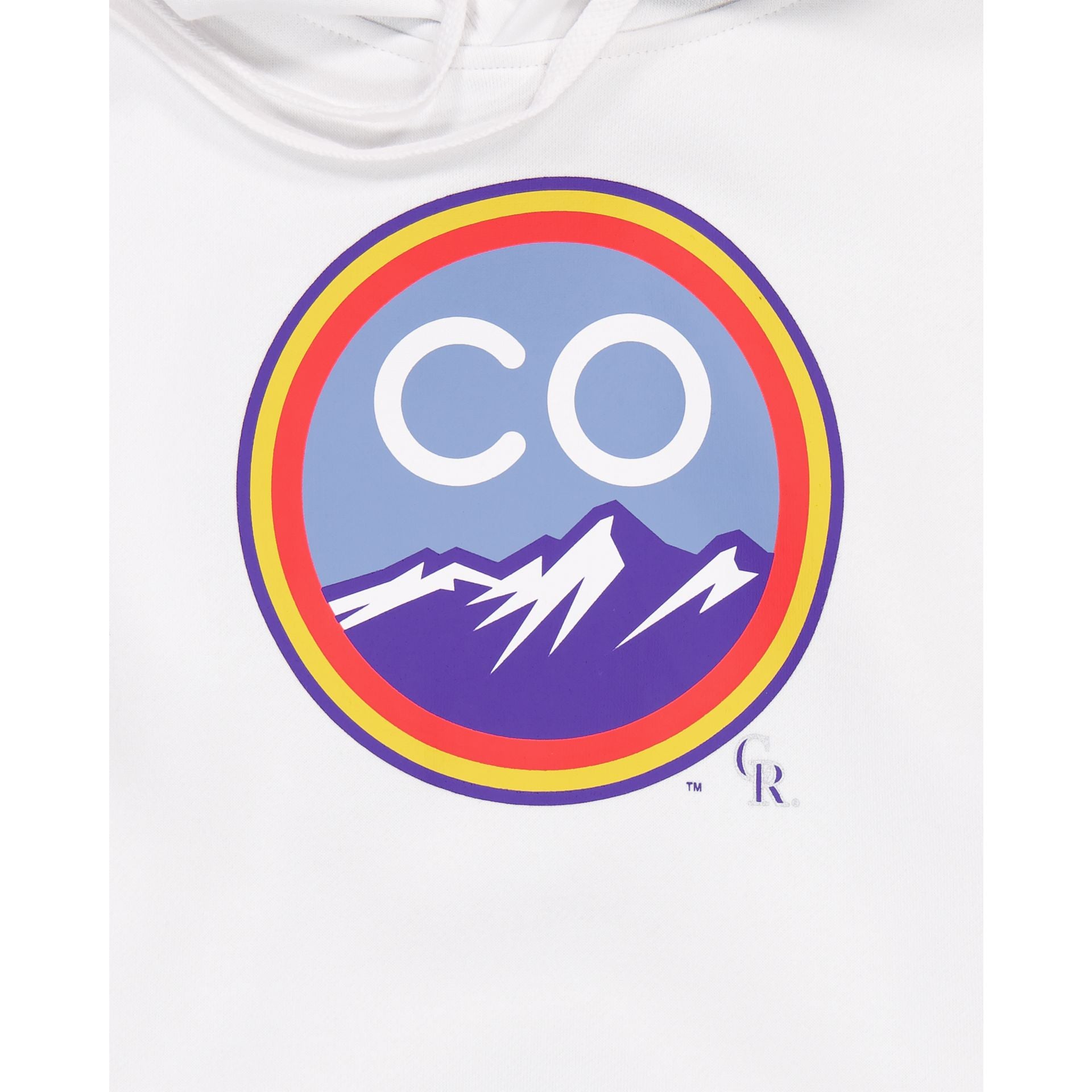 Jersey inspired. city connected. The Colorado Rockies City Connect White Hoodie features a screen-printed Rockies logo at the front with a Welcome To Colorado slogan at the left-wear sleeve.