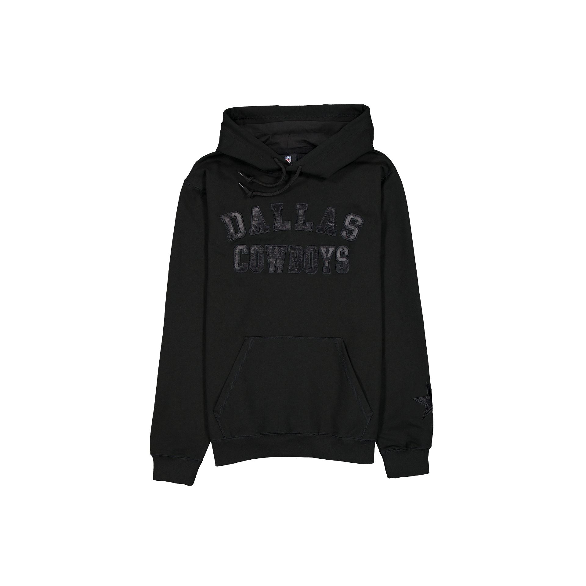 The Dallas Cowboys Black on Black Logo Select Hoodie features a satin applique with a tonal stitch Cowboys wordmark at the chest and an embroidered team logo at the left-wear sleeve.