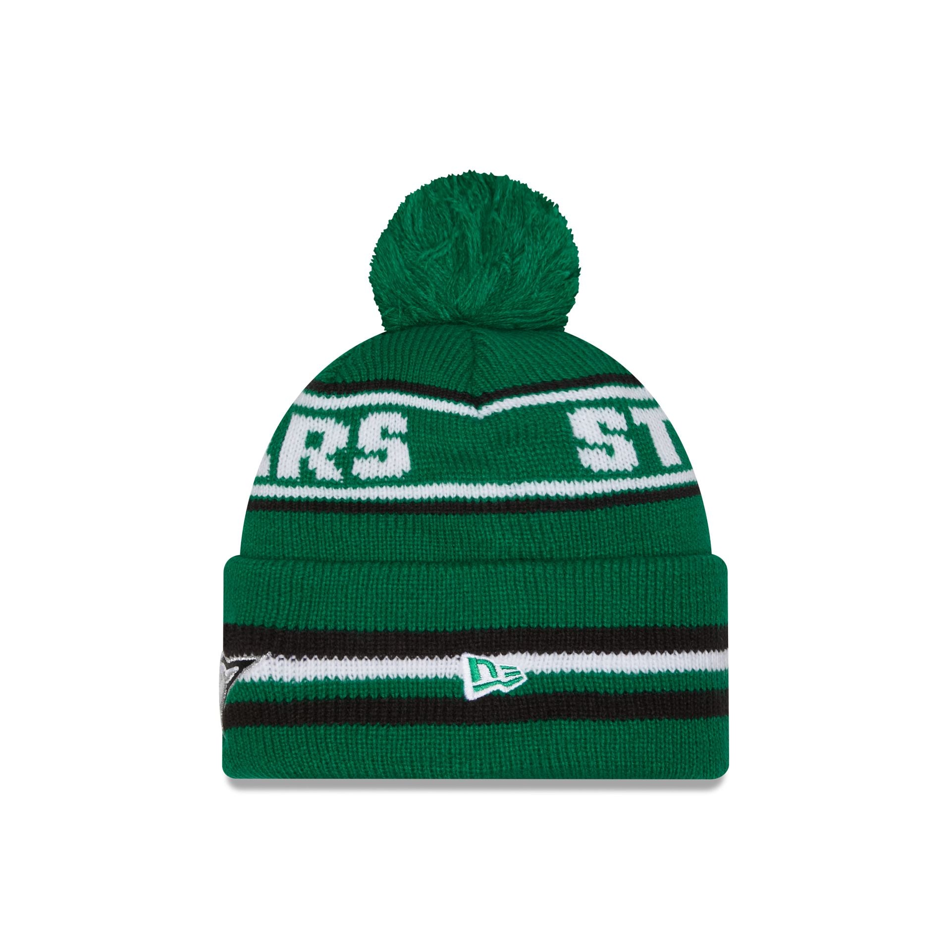 The Dallas Stars Classic Pom Knit Hat features an embroidered Stars logo at the front cuff with a wordmark at the crown and a one-time removable pom.